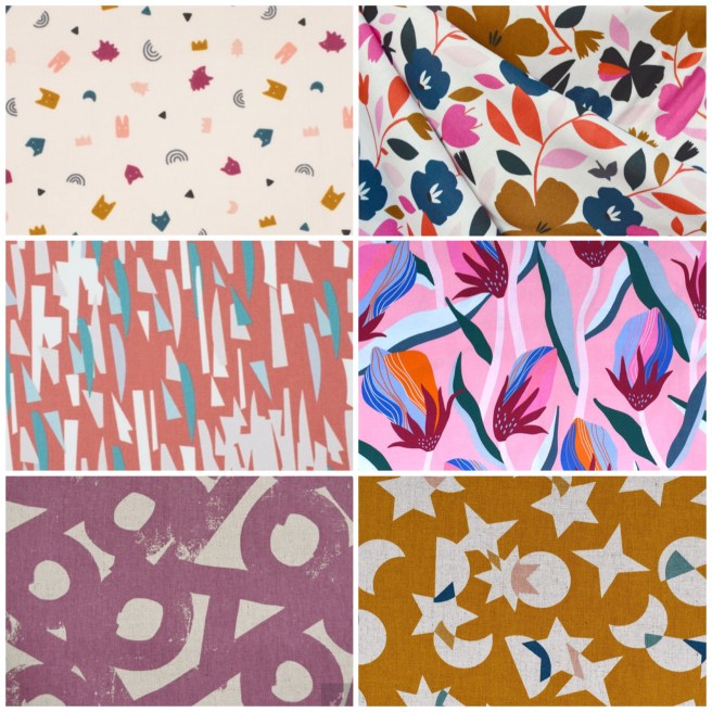 I also was surprised to see how drawn I was to abstract prints. I really like funky, artsy, chunky, colorful prints. The problem is that I have no idea how to find fabric that fits this category, that’s not too outrageously priced. I see stuff all the time from people I follow on Instagram who live in Australia but if you know of anywhere that sales this type of fabric in the USA, please let me know! But I may just resort to making an overseas purchase…Here are a few fabrics I found that fit the bill pretty well for me: