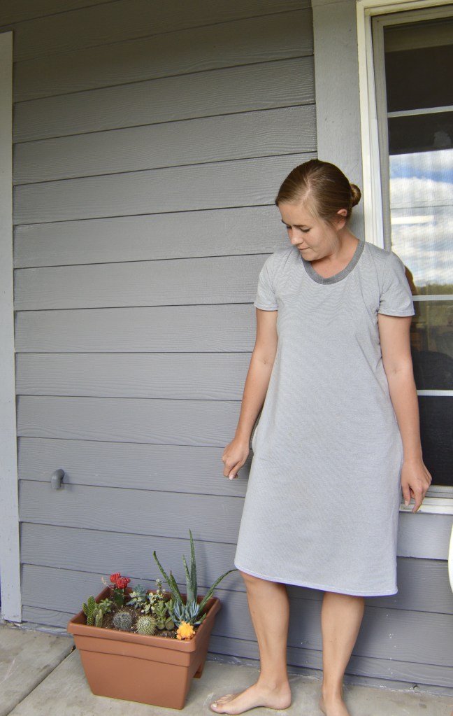When the weather started to turn warm here, I started craving a comfortable, non-fussy t-shirt dress. I’ve made a few Union St. Tees now and it has quickly become my favorite t-shirt pattern. A tried and true, for sure. Not to say I won’t use other tee patterns, but this pattern really is great and it fits how I want my t-shirts to fit (which is not too tight…but if you prefer tighter, you just size down). It’s got 3 different neck options, 4 sleeve options, and endless possibilities when you consider all the tweaks you can make to it to change it up. I knew turning it into a dress would be a breeze. It’s definitely not a new hack, but it’s a solid (and impossibly easy) one.