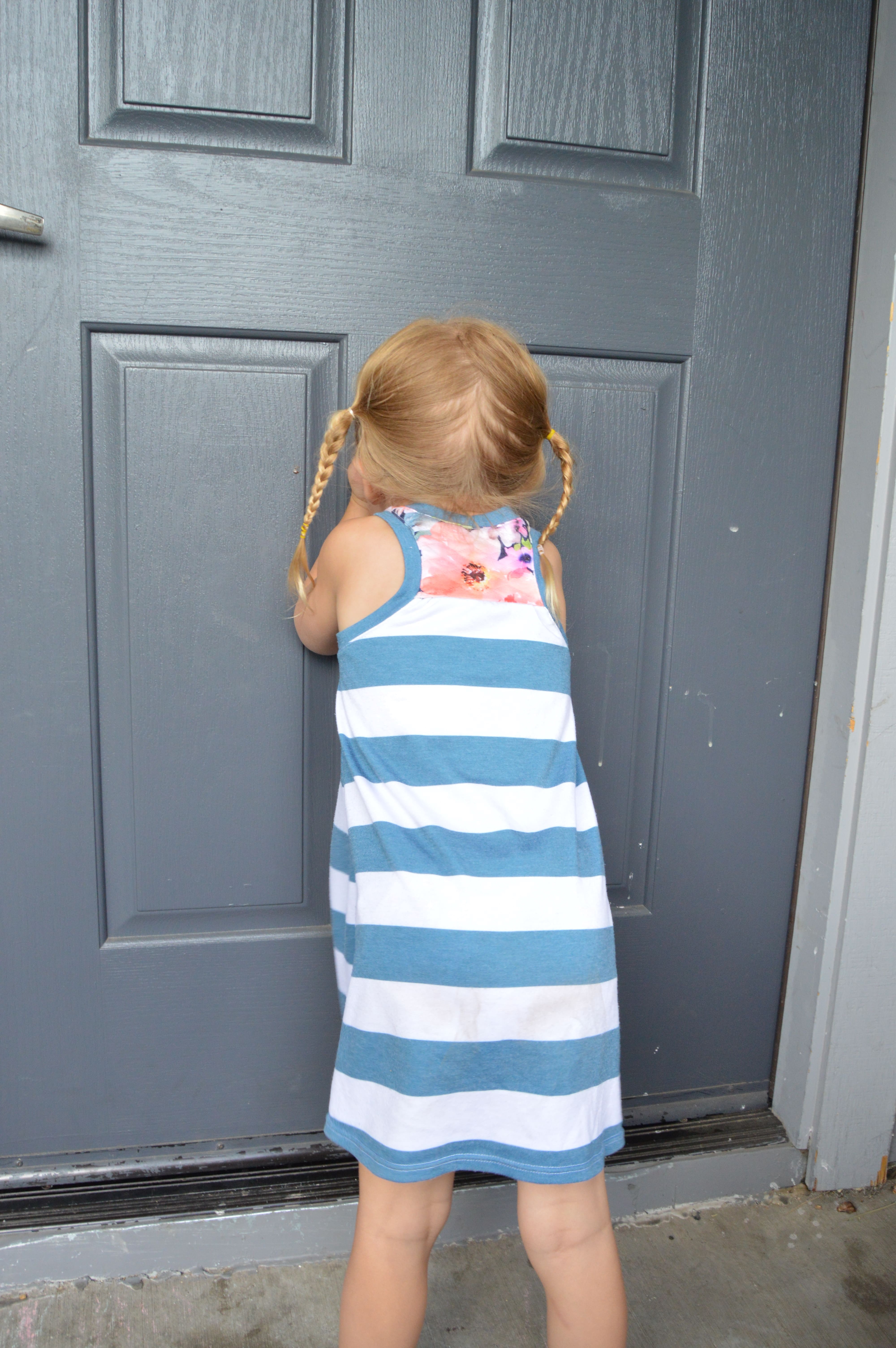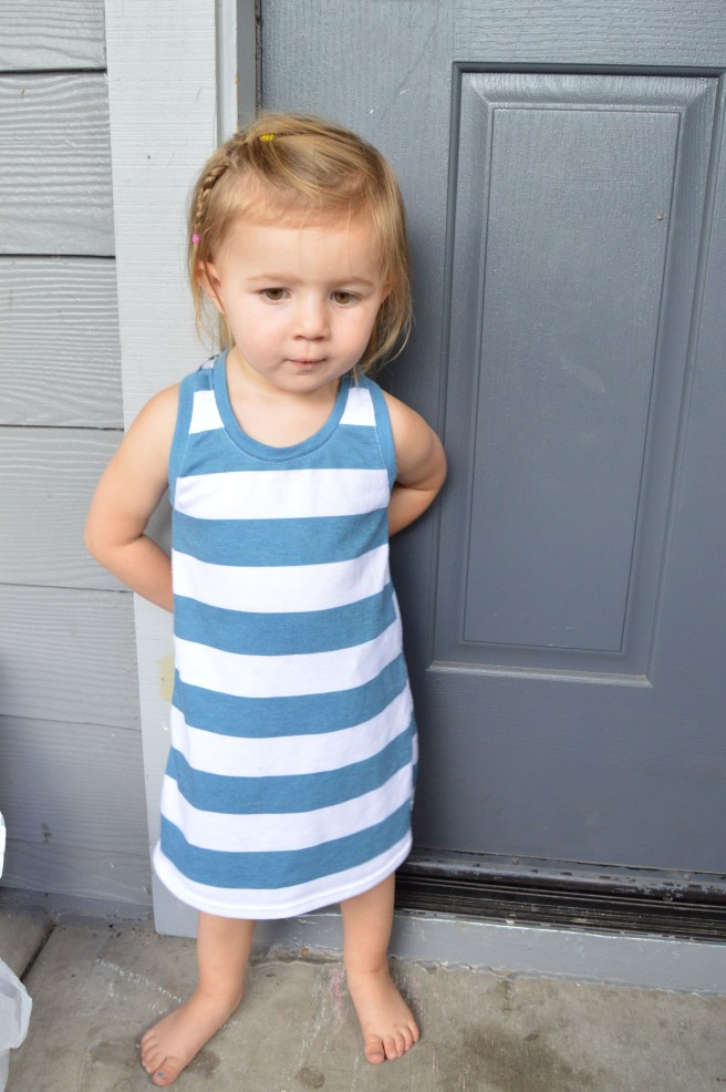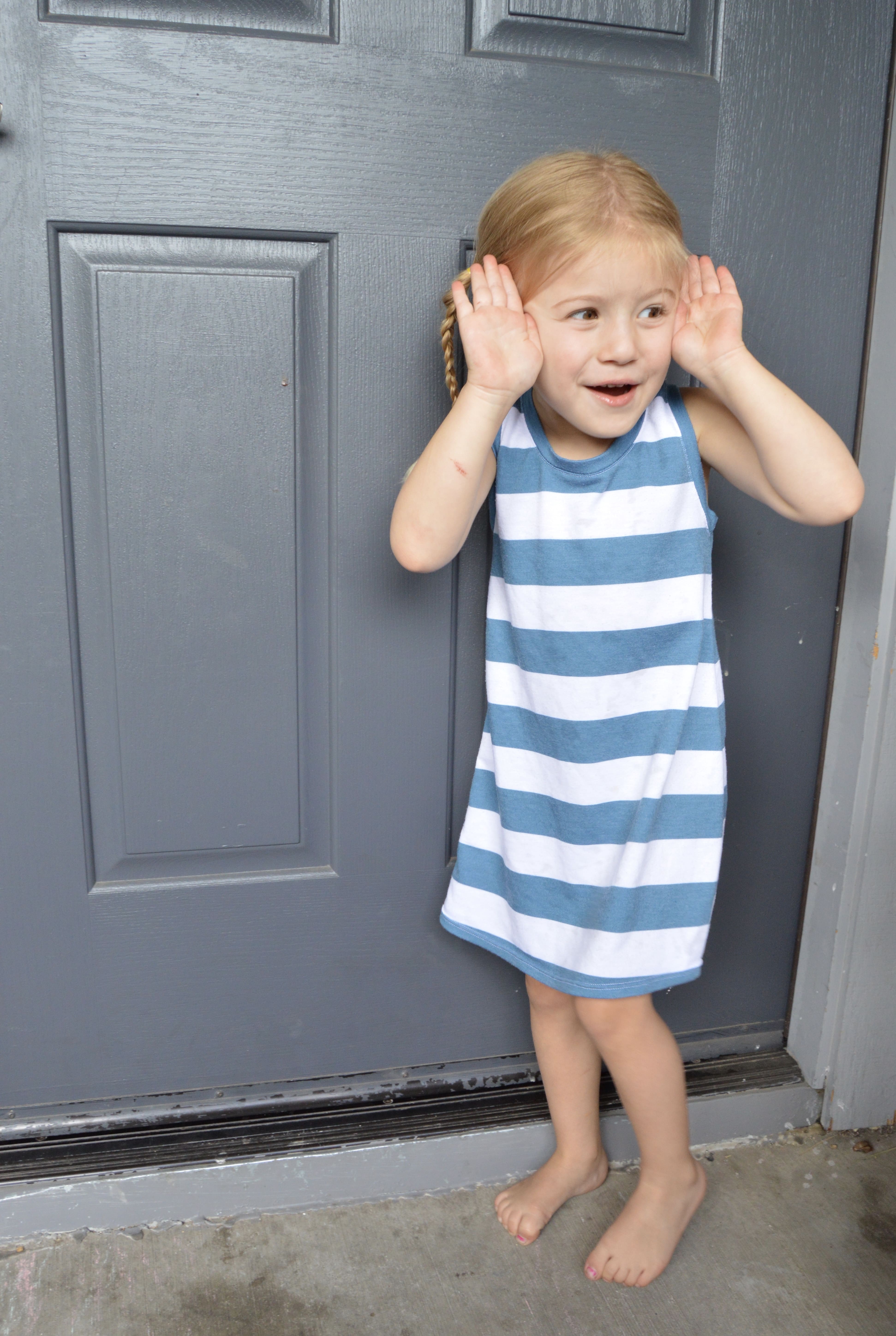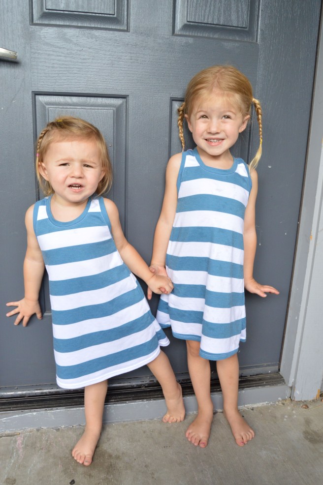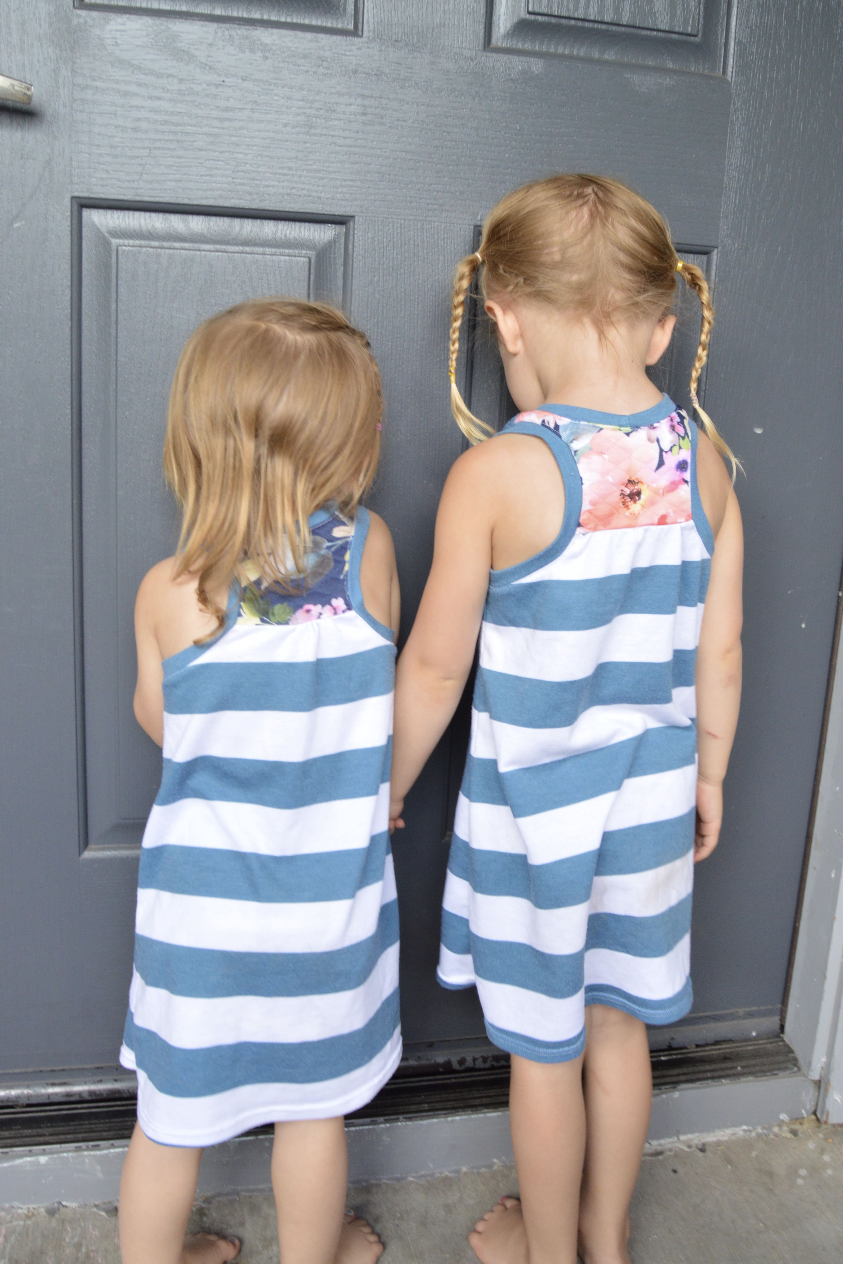 I think before having kids, I had all these great ideas about how my kids would dress. And even now, there are things that I see in stores or patterns I am drawn to because they are just so darn cute! But when I stop to think about it, I have to admit that sometimes the cutest things are not the most practical things. Awhile ago, I was pretty close to buying a pattern for a button up shirt dress for my girls. It was so cute and I imagined all the fun fabric I could find for it. But when I stopped to be real with myself, I realized that, if I ended up making those dresses, they would probably be worn one time and then never again. And it wouldn’t be because they weren’t cute, it would be because they weren’t practical. If wearing a dress was in order (like for church), my girls would much prefer to wear the frilliest, fanciest dress in all the land. And for all other occasions they usually choose something basic. I’m talking comfortable, non-fussy, easy to put on/take off by themselves. A woven button up dress would never (and I mean never) be chosen of their own free will and choice. So I hung up that idea (maybe we’ll try again in 5 years) and tried to look practically at their wardrobe needs (“need” is a loose term here). The girls have an abundance of clothes (thanks to all their older cousins!) but I do enjoy sewing for the girls on occasion, and I think they love to know when I’m making something especially for them. The one thing I felt like they don’t have enough of is play dresses. Simple, knit dresses that are great for playing in on warm days. Does the Hey June Racerback Dress not fit the bill perfectly???