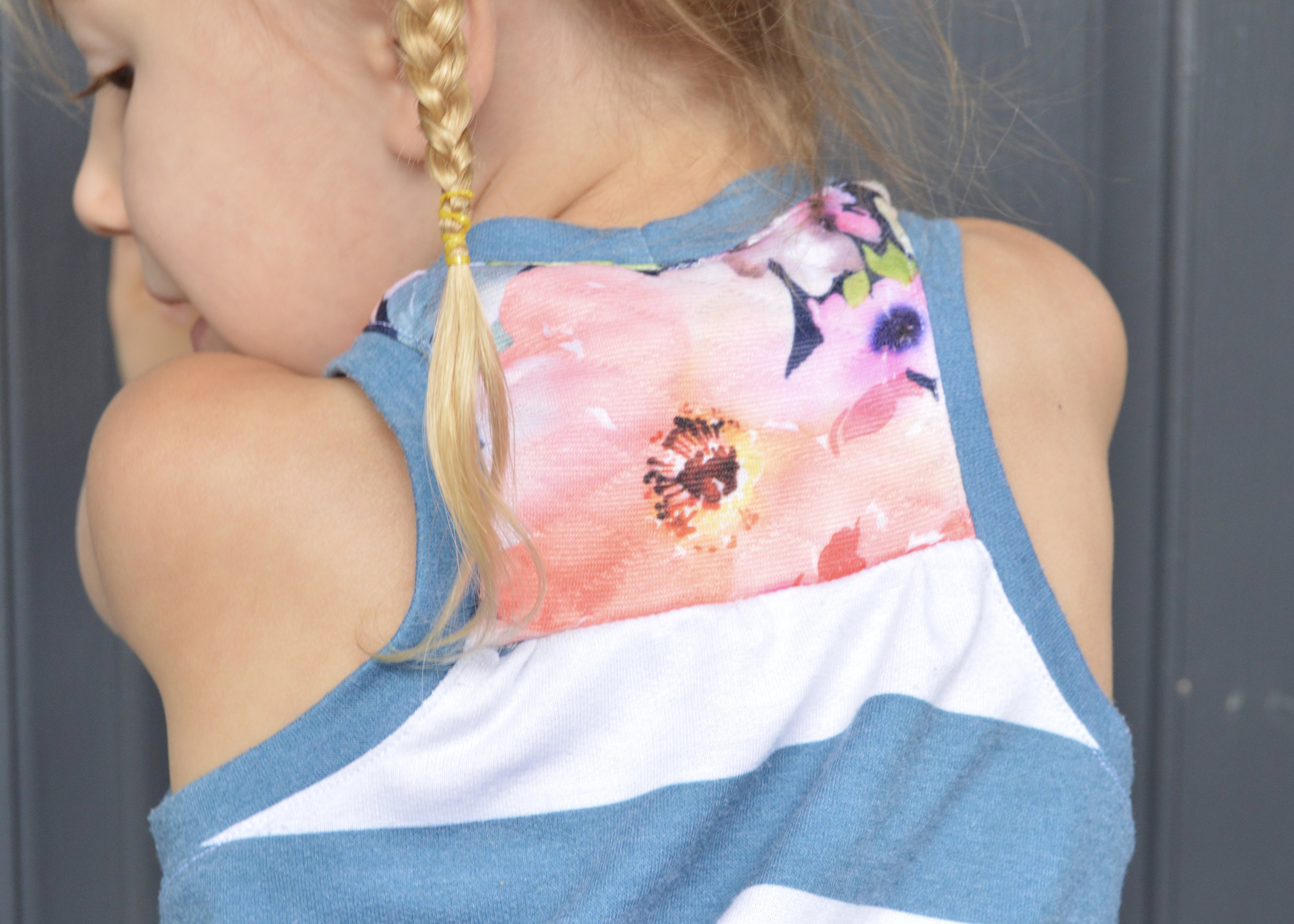 Eh? Pretty darn adorable in my book! Of course, the dress would still be very cute using the same fabric for that back panel. But it’s a great way to use up an extra scrap in a fun way. Both these fabrics have been in my stash for awhile but they are from Raspberry Creek Fabrics. The blue stripe is a lighter weight French Terry and the floral was a misprinted jacquard (it was printed on the wrong side, but you really can’t tell).