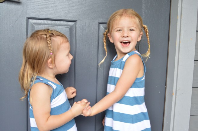 I finished the dresses while the girls were asleep and in the morning when I told them I had made them dresses, they were both so excited. Greta ran into the sewing room and grabbed her dress jumping up and down. Maybe that’s why I keep sewing them things 🙂