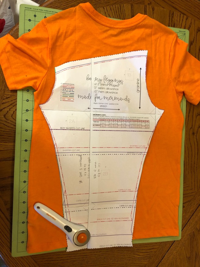 As far as her costume went, the hardest part was actually finding knit orange fabric to turn into her cat body. But this actually worked in my favor as I ended up just getting a couple shirts from Old Navy: one to use as her actual shirt and one to turn into pants, which you can see I did in the picture above. The best part about turning a shirt into leggings is that the bottom is already hemmed for you, so if you cut it right, there’s no need to hem! Great for me so I didn’t have to buy two spools of never-to-be-used-again bright orange thread. For the leggings, I used the FREE Bonny leggings pattern from Made for Mermaids. I’ve never used their patterns before but I really like this one! It comes in like 4 different lengths plus you can add on a circle skirt, not to mention the sizes range from 6 month to 14 (!!!), so it definitely has many uses. One of my favorite things is that it fit my very skinny Wendy, without any alterations. I’m sure it’ll work for less scrawny kiddos, just make sure your fabric has some good stretch (mine did not).