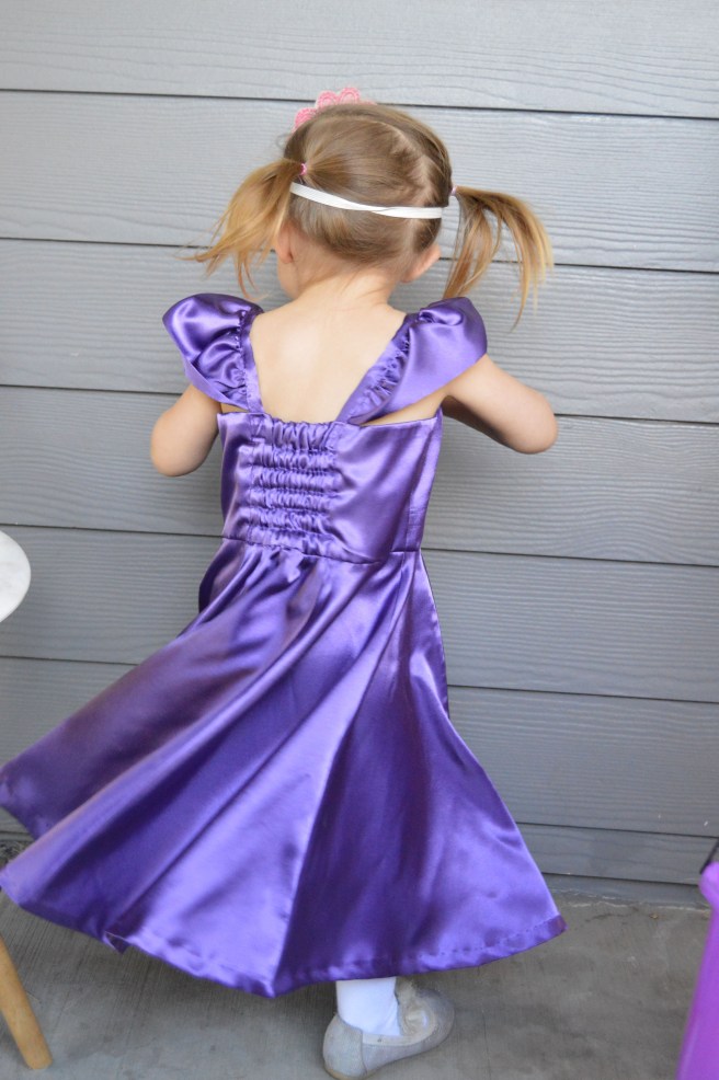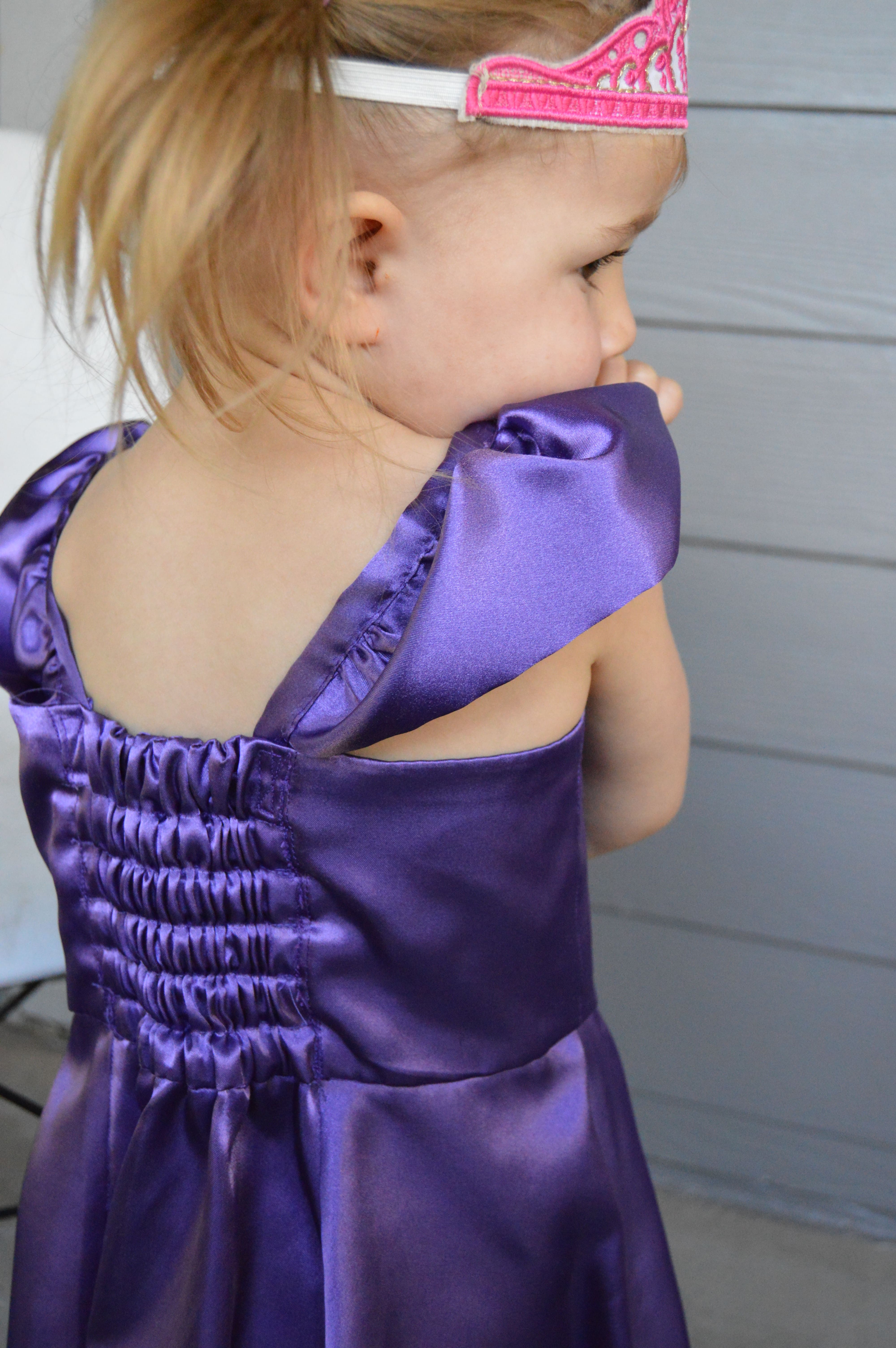 For her dress, I also chose a free pattern which is the Patsy Party Dress from Rebecca Page. This dress was actually trickier than I was expecting, but I think the end result is gorgeous. I think there are a lot of great free patterns out there but I think it’s rare to have one that has so many great details. In particular, I loved the back of the dress and the fact that elastic is used to make the dress fit instead of something more finicky like buttons or a zipper. Since I knew this dress would likely become a favorite in our dress up box, I loved that it had this kind of fit factor. The dress is easy for a toddler to pull on and off and since it uses elastic, it will fit for a long while yet.
