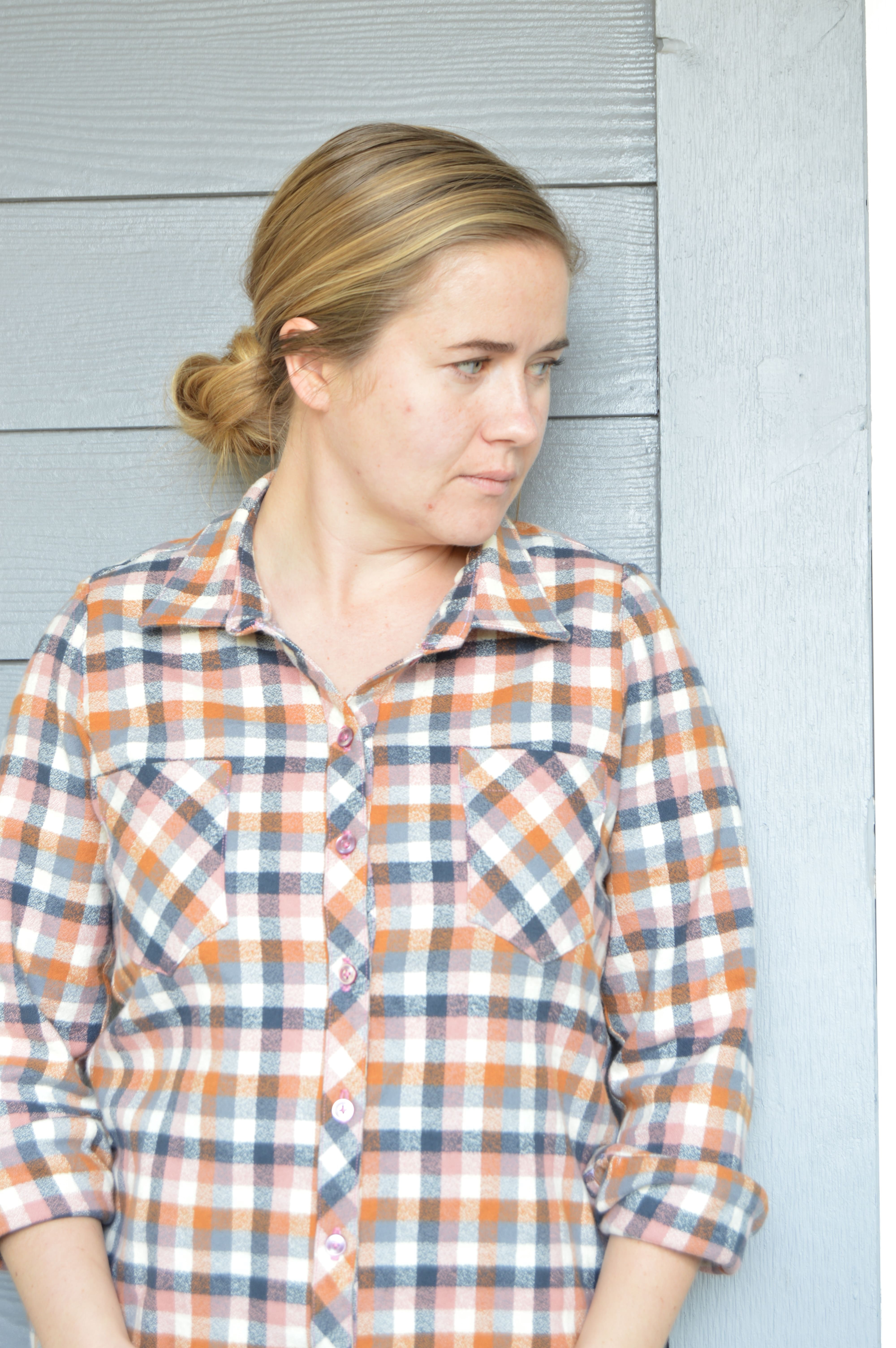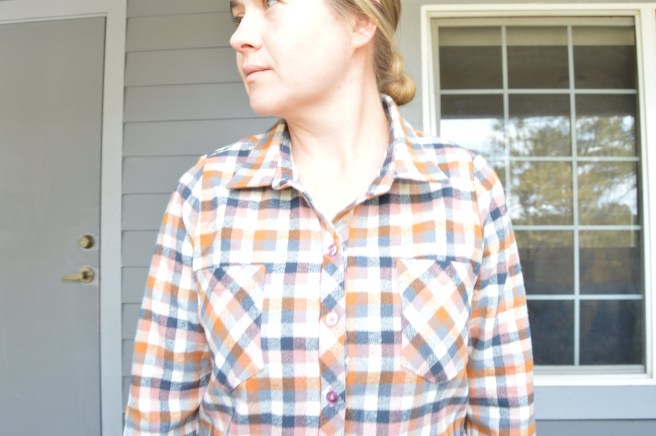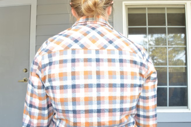 My biggest issue with the muslin was how big the collar seemed. Here’s the thing: On none of the other photos of this shirt do I think that the collar seems big. I trimmed the collar up for my plaid version, and while I think the collar on the finished plaid looks good, I don’t think it would look bad if the collar was bigger. Basically I’m saying that I don’t know what my deal is. Maybe the collar is big, maybe it’s not? Maybe it’s not a big deal? I only took a small amount, maybe 1/4 inch, from the corners for my final version. The back of the collar remained the same.