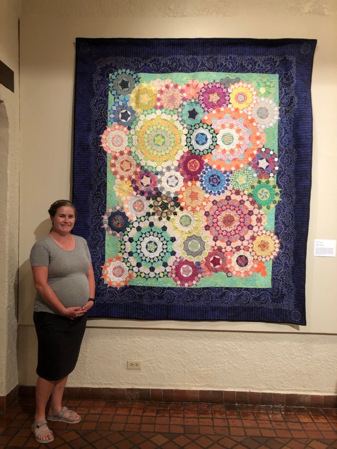 My La Passacaglia was in a quilt show! And you get to see a rare photo of me pregnant (at least this time around I’ve been avoiding cameras fairly successfully). Every summer, the art museum in my parents town (Springville Museum of Art) does a quilt show and while I was working on my Passacaglia, I knew I wanted to enter it into the show. Unfortunately the show was canceled last year due to CoVid, but they were able to have it this year, so both my mom and I entered one of our quilts. We heard they had more entries than ever and had to be a bit picky about what made it in, so I felt very lucky that mine did. I know it’s silly, but I felt pretty proud having my quilt hanging on the wall of the museum.