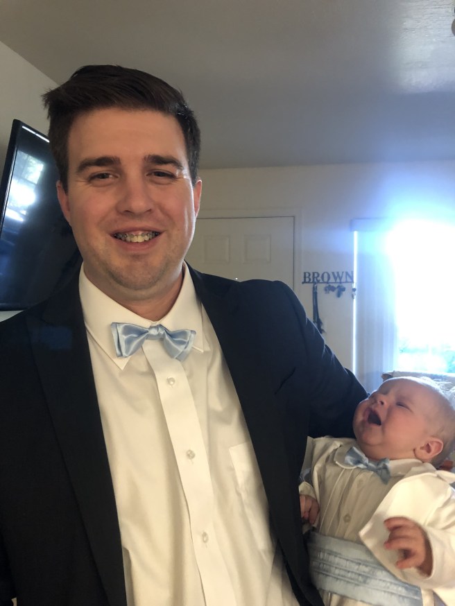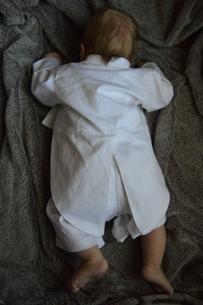 So the sewing did take some time and require a bit of tweaking. But when we finally put the whole outfit on, it was heart eye emojis all around. Owen looked so adorable in his little tuxedo. I guess that’s another benefit of sewing clothes for babies: the baby makes the finished product shine.