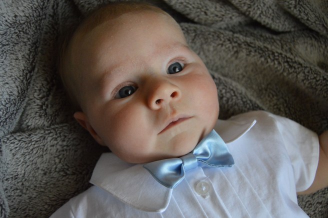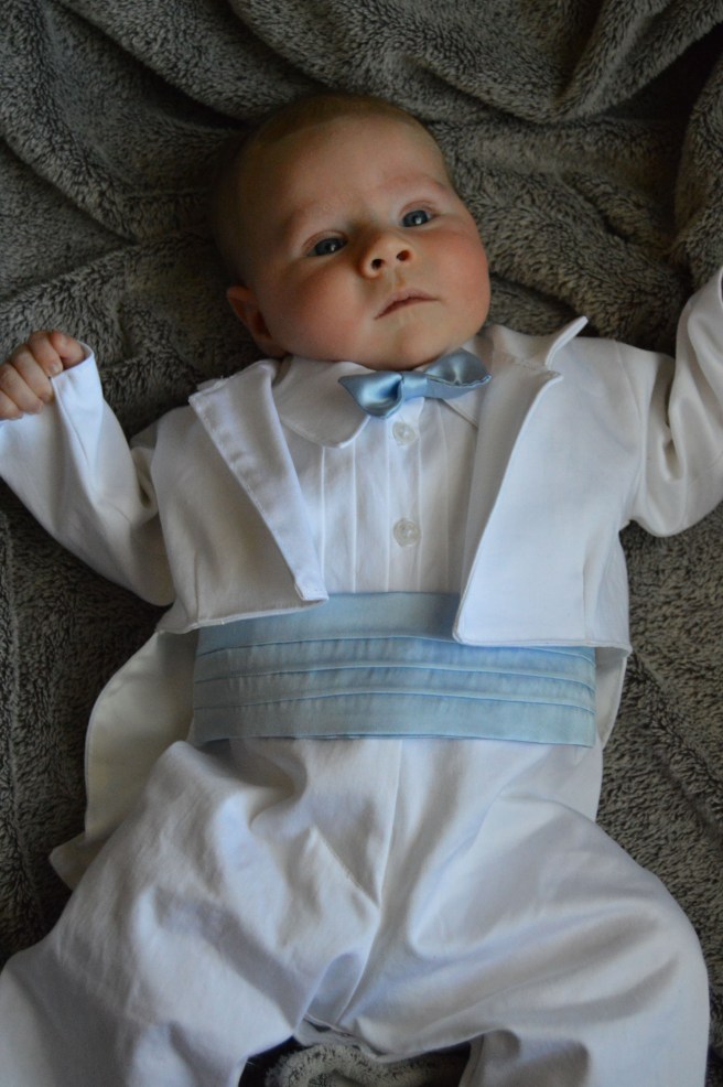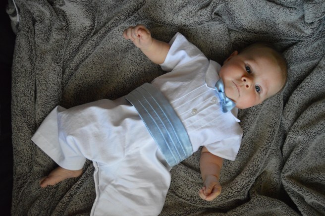 When my twin and I were blessed as babies (did you guys know that? I have a twin!) my grandma made my twin (who’s a boy) the sweetest little tuxedo to wear for his blessing. My brother has since used that same tiny tuxedo to bless his own sons and I always thought I’d borrow it to use for Owen. But the original, grandma-made tux is in South Dakota (where my twin lives) and in the end we didn’t think it would fit Owen, so wouldn’t be worth shipping to us. So I had to make my own!