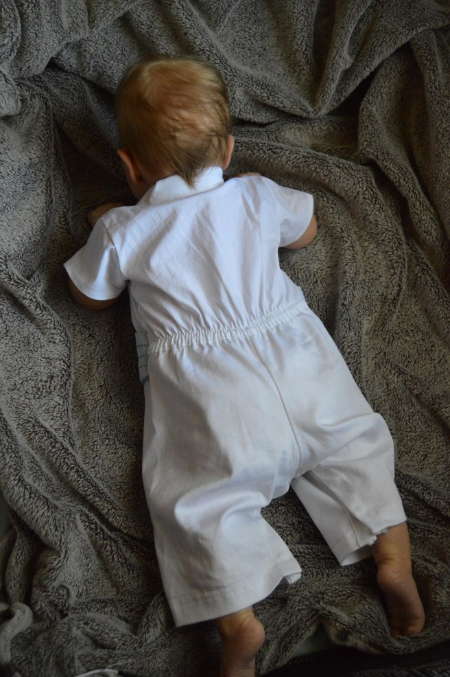 As far as order of construction goes, you sew the top first, then the pants, then you connect the two. At this point I put the jumper onto Owen to see how it fit and it was big, mostly in the pants. So I unpicked where the pants and shirt were connected and I started chopping. I took 1/2 an inch from the bottom of the shirt. I took 1 inch from the top of the pants and 1 1/4 inch from the bottom of the legs. I was actually happy to take off the hem because it looked a bit of a train wreck and looks much better now. And it fits much better too! Fit for baby clothes isn’t nearly as finicky as it becomes for adults. Hacking away and resewing takes time but not very much brain power, so not too big a deal.