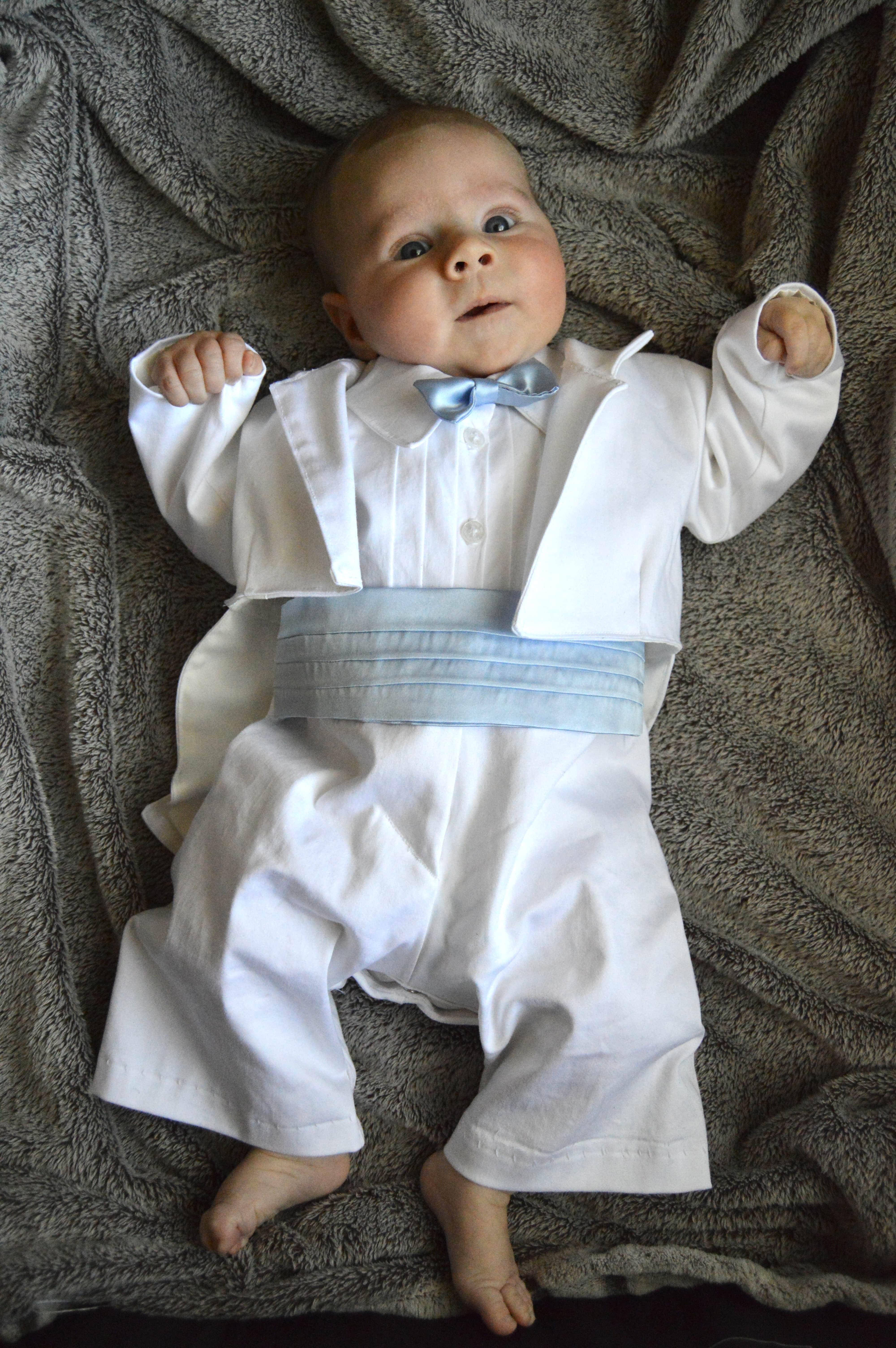 When my twin and I were blessed as babies (did you guys know that? I have a twin!) my grandma made my twin (who’s a boy) the sweetest little tuxedo to wear for his blessing. My brother has since used that same tiny tuxedo to bless his own sons and I always thought I’d borrow it to use for Owen. But the original, grandma-made tux is in South Dakota (where my twin lives) and in the end we didn’t think it would fit Owen, so wouldn’t be worth shipping to us. So I had to make my own!