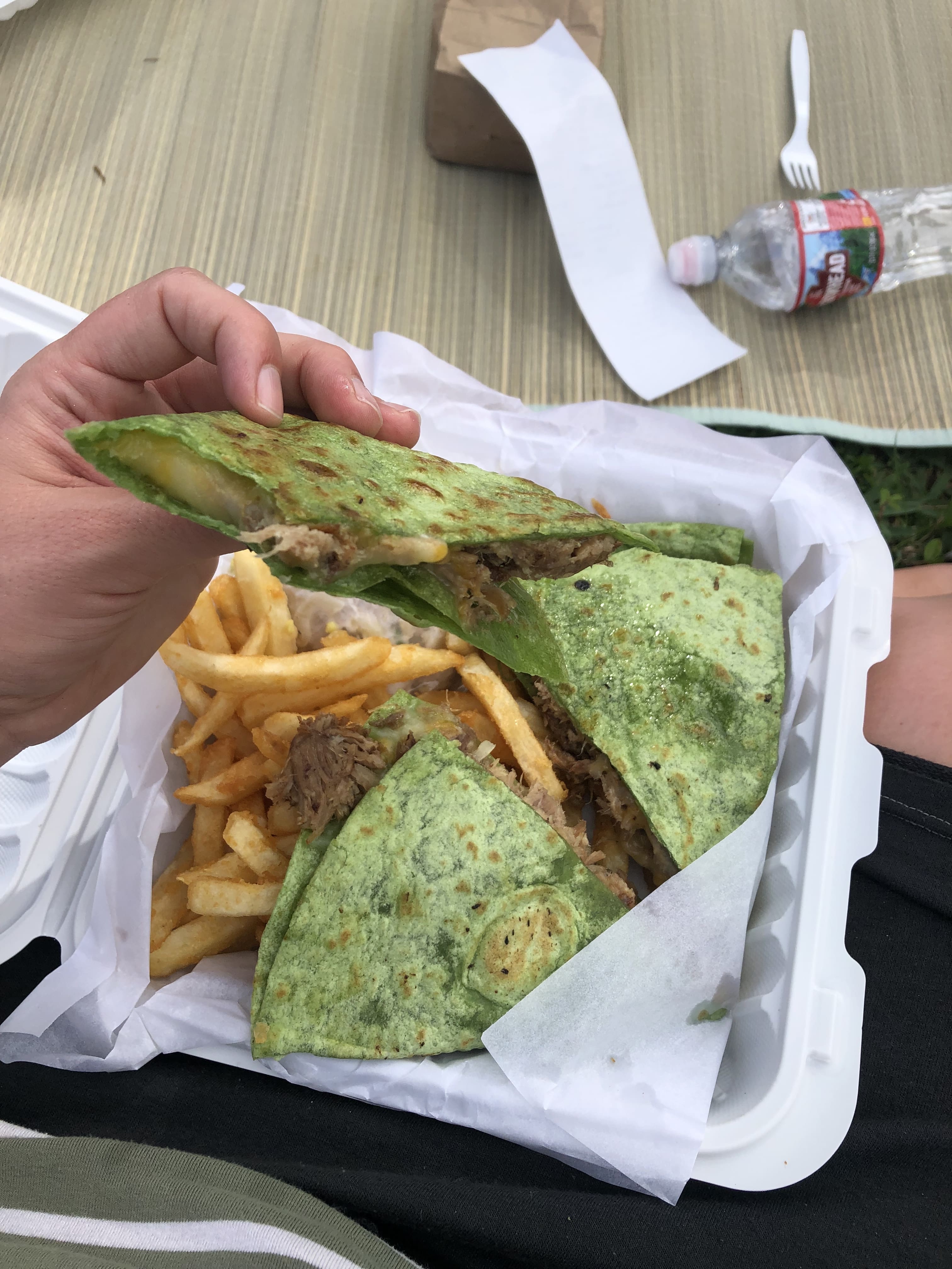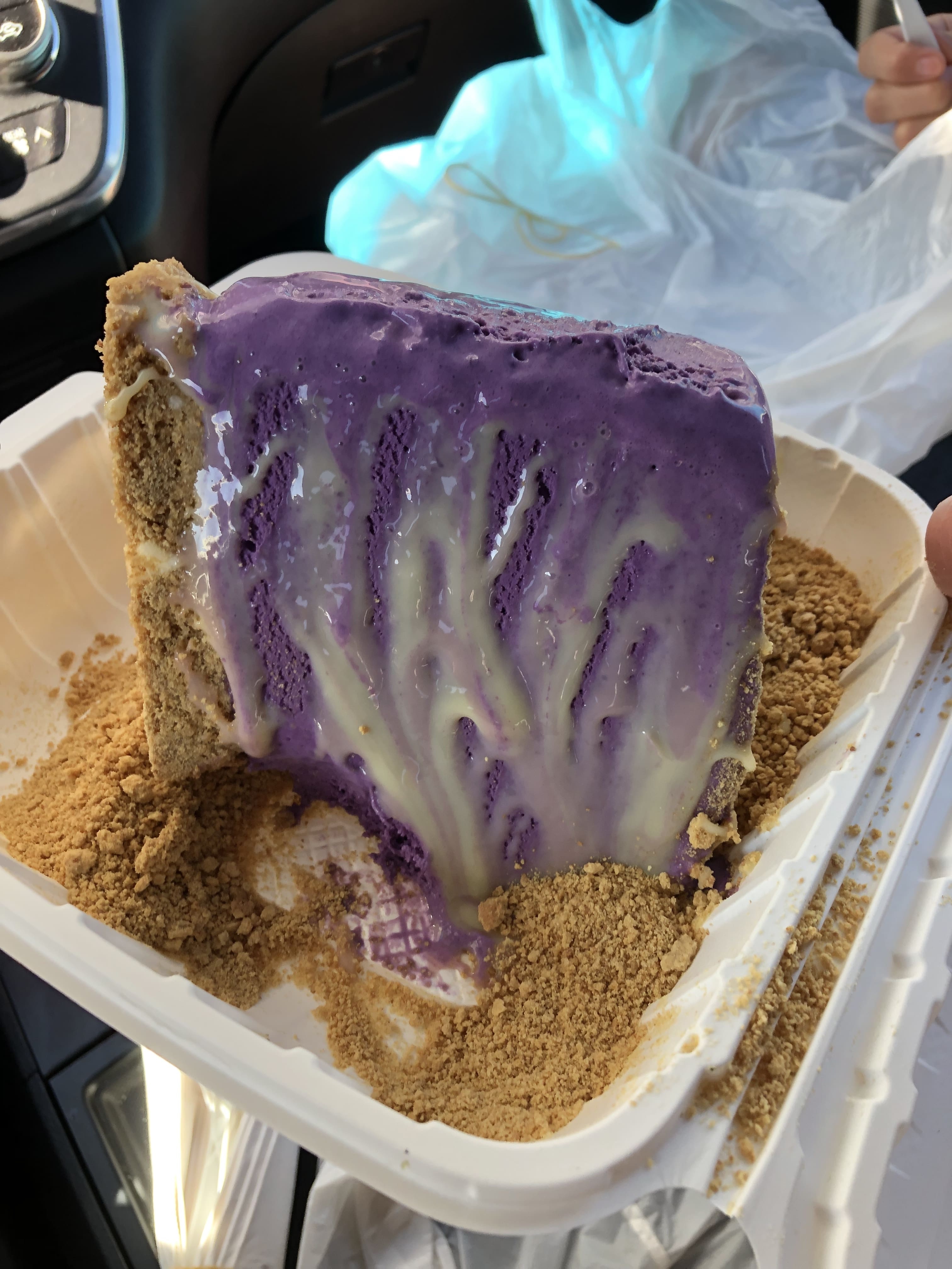 Broke Da Mouth Grindz (in Kona): This was my favorite of the food we ate. It was so flavorful and absolutely mouth watering. We ended up eating here twice because it was so good. They offer a plate that includes three of your choice of their entrees as well as the usual mac salad and rice. We tried their regular and spicy furikake chicken (I can’t describe the taste but I will tell you that I could not stop eating it), kalua pork, garlic shrimp as well as their avocado burger, all of which were insane. We got a fresh lemonade that was great and we also tried their ube ice cream cake (again ube is a purple sweet potato). The slice of cake is humongous and indeed it claims to feed 3-4 people. All 5 of us food-eaters (we’re excluding the baby, here) on the trip ate more than our fill of the delicious cake; there was plenty and it was so good!