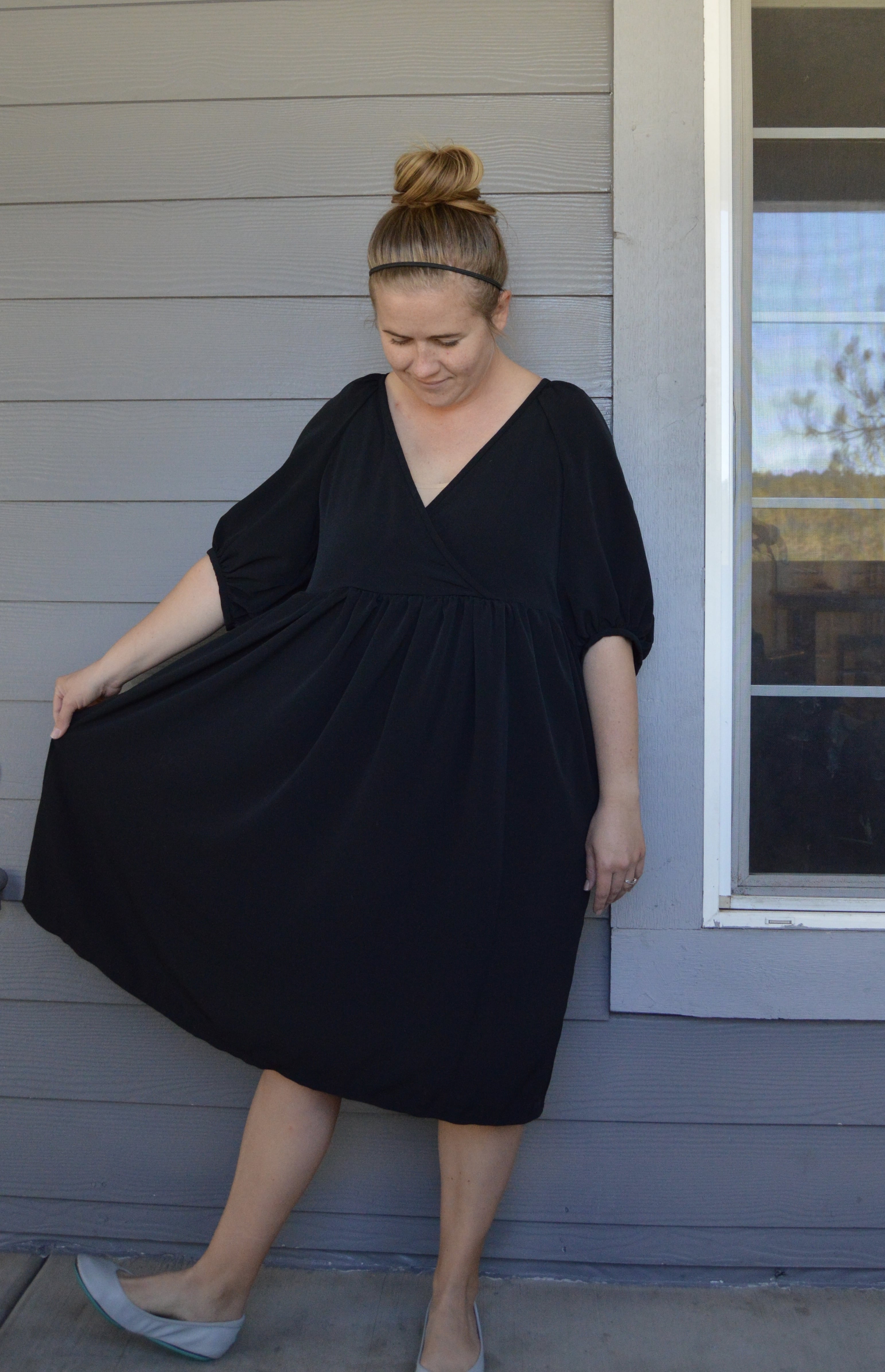 For my first version, I made a couple of alterations. First, I shortened the sleeve length by 4 inches. Yes, four inches is a lot. But I don’t in particular like long sleeves and with my Cielo top (which has a similar sleeve) I also had to take off some length, but after the fact which was difficult. Four inches was bold and I hemmed and hawed but ultimately decided to stick with it. It’s too short, I’ll admit. Meeting in the middle at two inches would’ve been the better choice so I noted that for my second version. I also added 4 inches to the length of the skirt. Now, adding length isn’t necessarily something you’d think I’d need to do as I’m pretty short but I prefer my skirts to be to my knee or below because chasing kids around in anything shorter is not something I’m into, so it might surprise you how often I lengthen. But adding length is safe and easily changeable. Here, the four inches was great, right about where I wanted my hem to hang. I also added pockets. I’ve tried to be more judicious in considering things that have no pockets but this dress seems to want to have pockets, right? At least that was my interpretation so I added them. In the black dress I added them way too low (I don’t know why but I sure seem to like making this mistake often) but I fixed it in the other version (placing them 4 inches down from the top of the skirt, fyi).