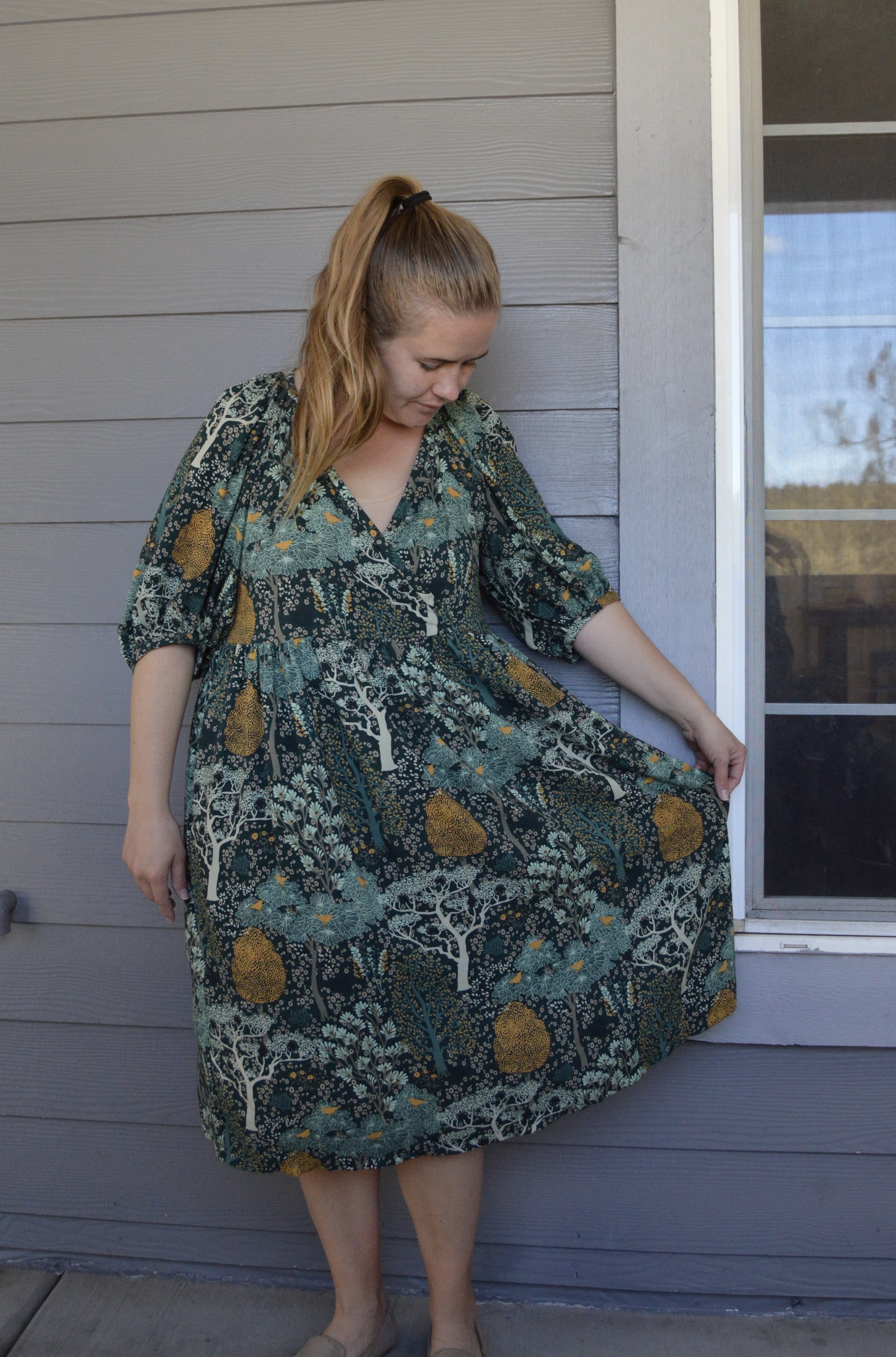 The dress is super cute and fun and I haven’t seen a version of it yet that I don’t like. It seems to work well in a variety of fabrics and just now as I’m writing this I’m thinking I ought to try making myself a velvet version and perhaps a hacked one with flutter sleeves and a tiered skirt. But I’m getting ahead of myself. There are 4 versions of the dress included in the pattern, the most popular of which is view A (which is the view you see here). I’ve heard people call the silhouette “nightgown-ish” and while I see what they’re saying, I disagree. Or maybe it’s that I don’t mind a nightgown-ish silhouette. In any case, I think the best feature of the dress are for sure the sleeves. In the words of Napoleon Dynamite “They’re real big.” And they are, but somehow less voluminous than the ones in the Cielo top. The dress also features a wrap style bodice and just a regular skirt but gathers galore in both the sleeve and the skirt.