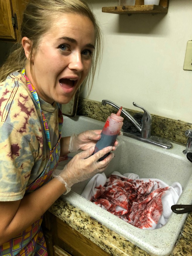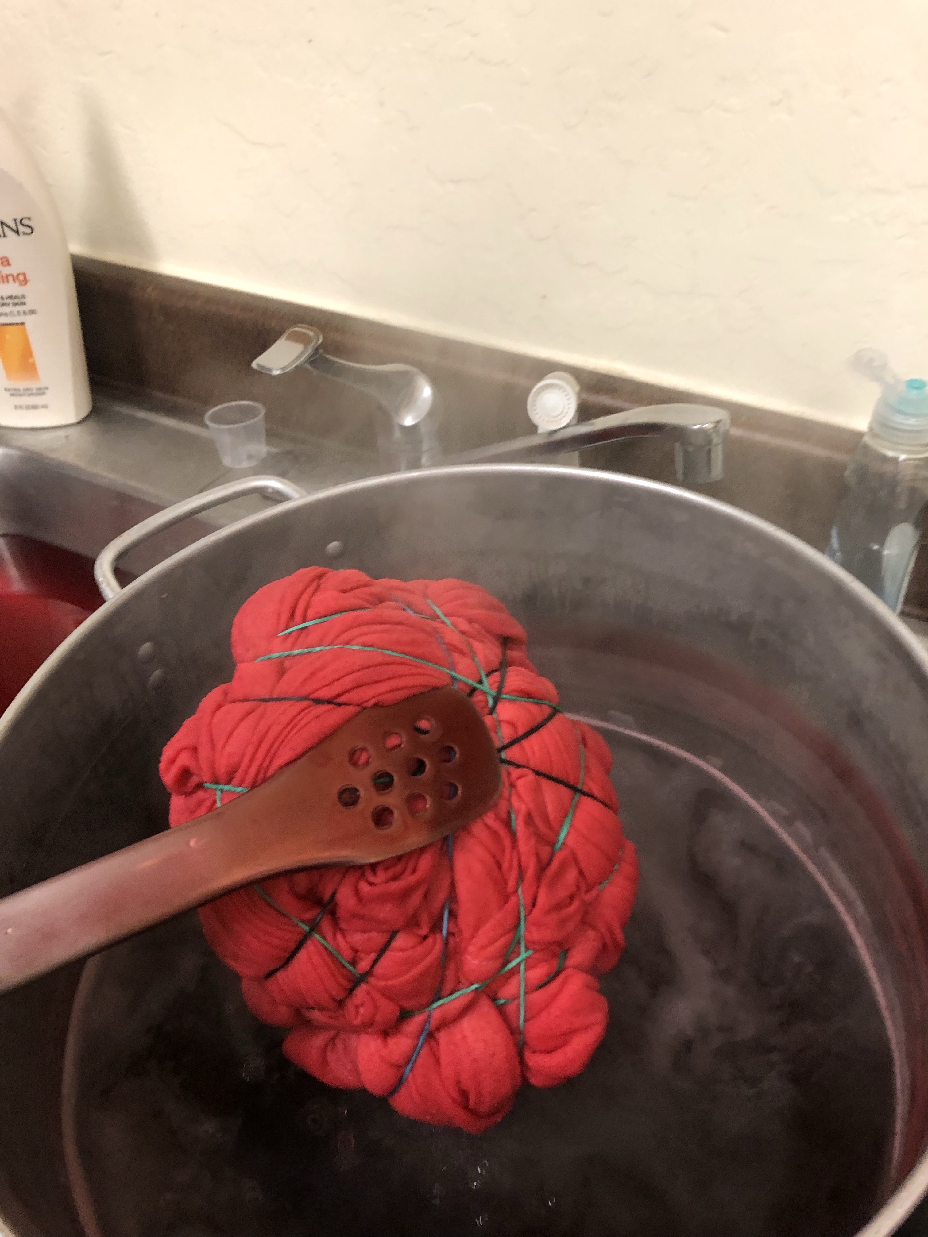 So. The fabric was still usable. It had been dyed but I figured if I got the right dye, I could over-dye it. This time I did a bit more research and ended up getting Rit DyeMore for Synthetics which, like it says, is for dying fabric made of synthetic material. I borrowed a giant pot from my neighbor and got to dyeing, which as a totally different process than the Procion dye bath, namely that you have to boil water and stir and stir and stir over this big pot of dye and make sure your fabric is fluid and moving and not just dying one part of your fabric. It is not hard but it is a bit hot and a bit tiring. I was worried about making things too dark so I pulled the fabric after 30 minutes I believe. The fabric was darker than it had been with the Procion dye but I wish I’d left it in longer so that I could’ve gotten some deeper colors.