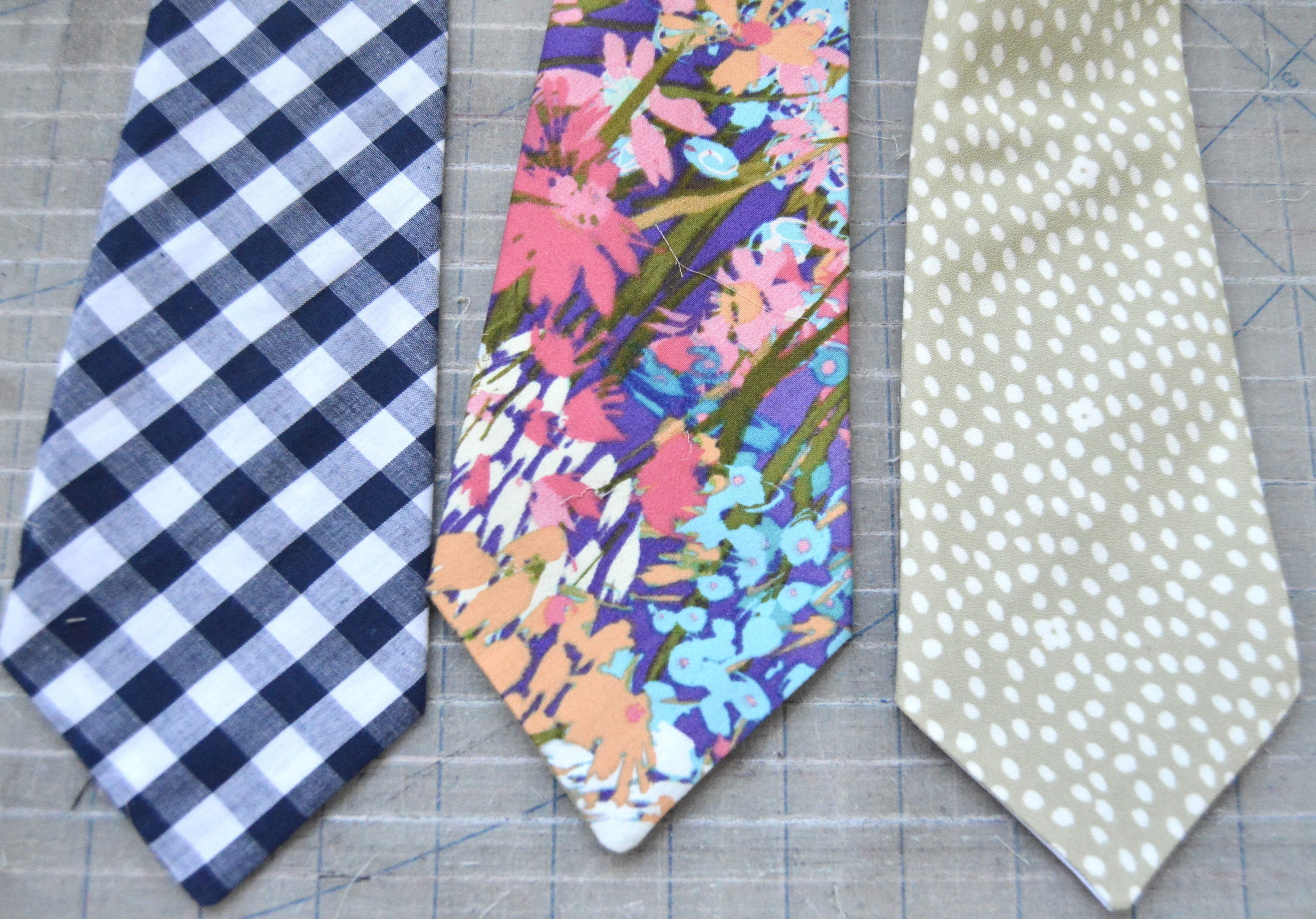 Somehow, that first year, I ended up landing on the perfect tie fabric. It was crisp and sturdy with just the slightest bit of stretch. Since then, I’ve tried lots of different types of woven fabrics, with varying degrees of success. Some of them have turned out poorly enough that I didn’t even bother to include them in the pictures. Just know that learning what fabric works has been a trial and error effort, one that’s ongoing.