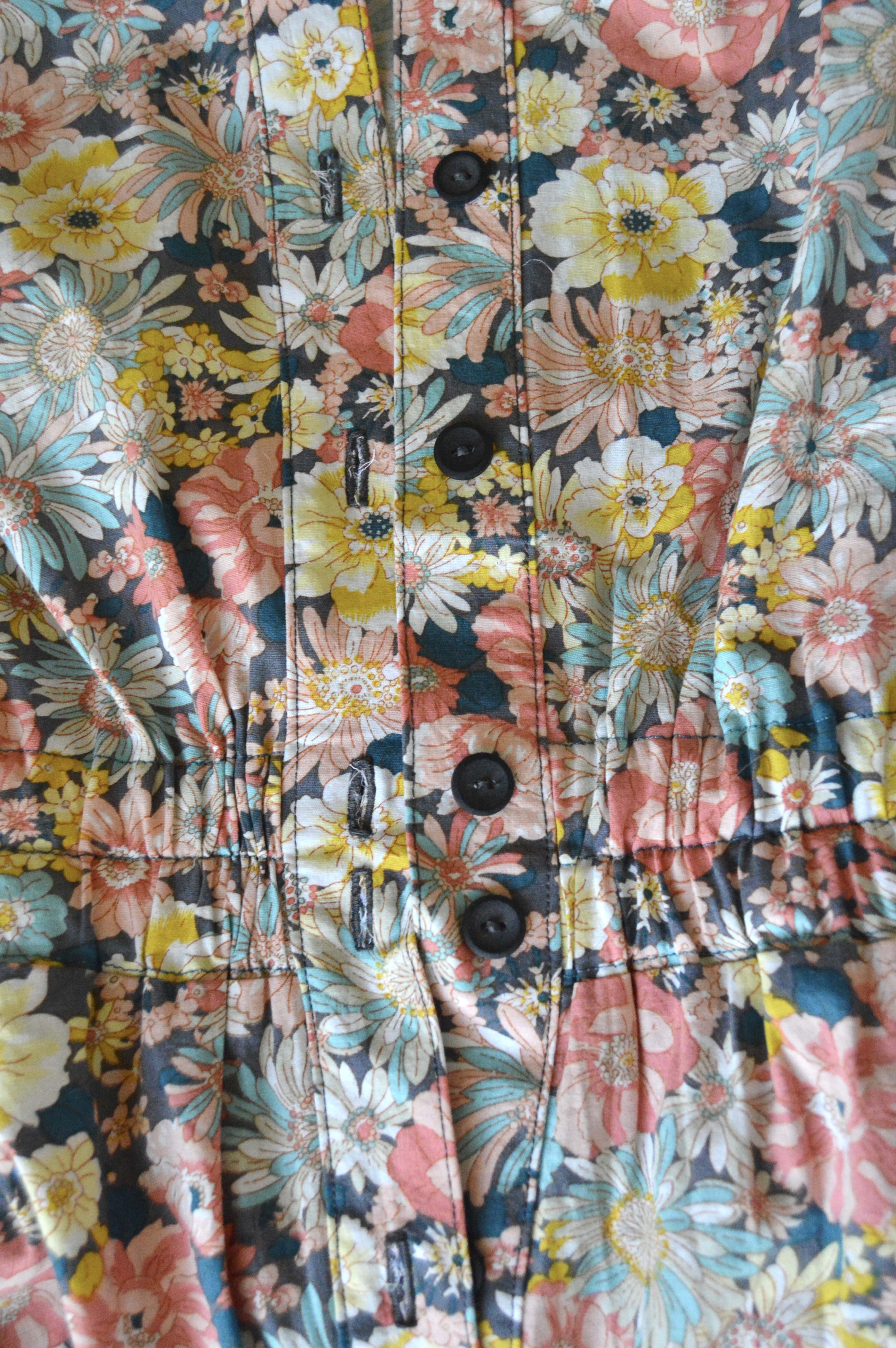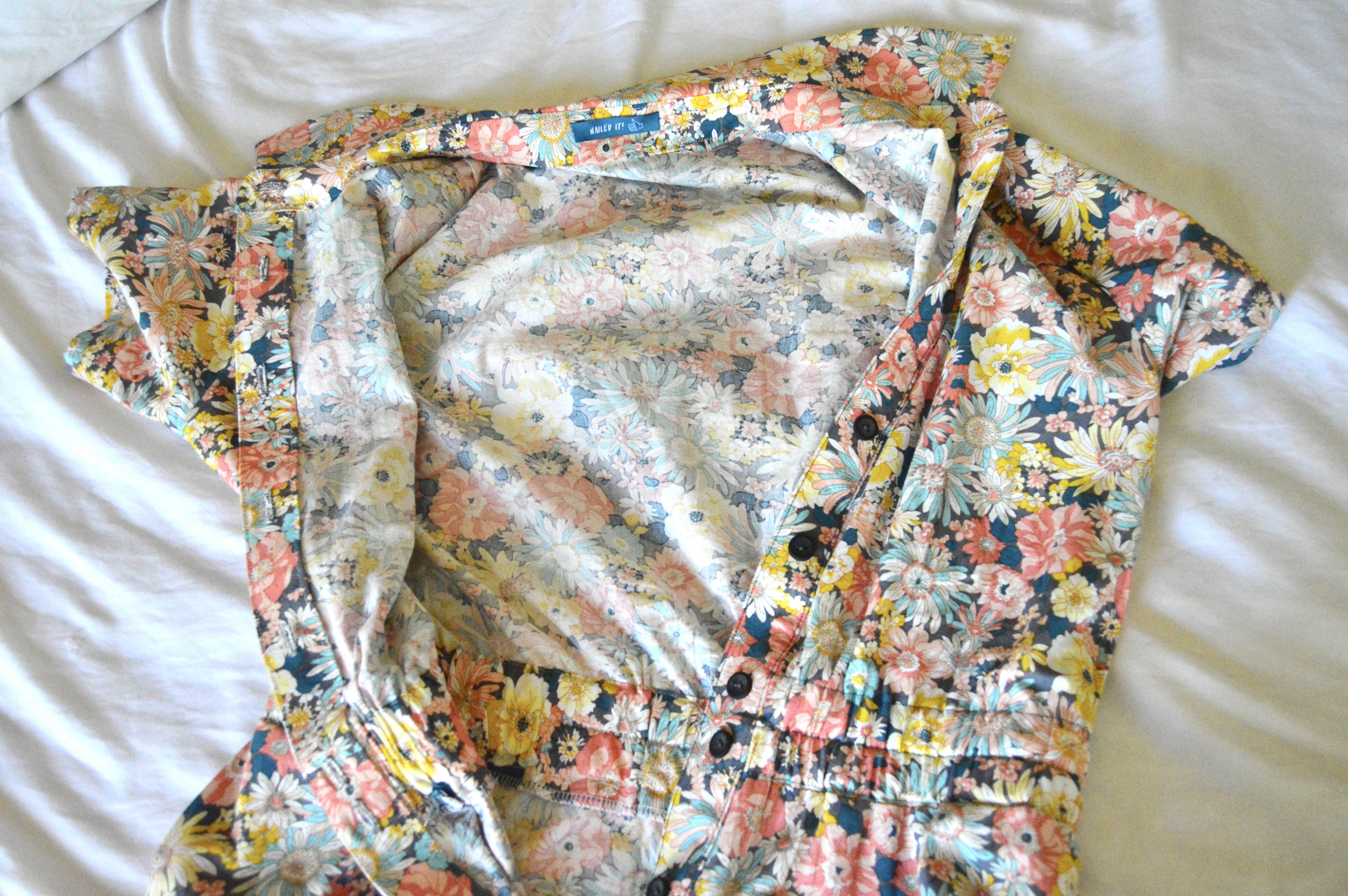 The fabric is a cotton poplin that’s fairly lightweight. It’s a lot more colorful than anything I have in my wardrobe currently (which is mostly filled with solids) but they are all colors that I love. In fact two of the featured colors were my wedding colors so maybe that’s part of my attraction to the print. When I bought it, I was trying to be more realistic about my fabric measurements so I bought 3 yards, which turned out to be a good choice as it was mostly all needed.