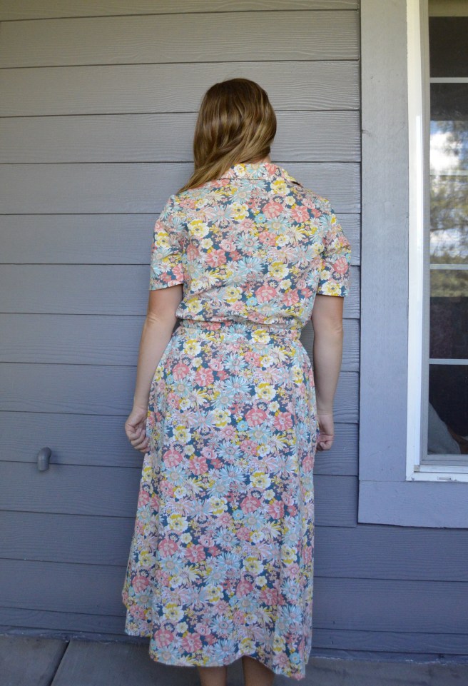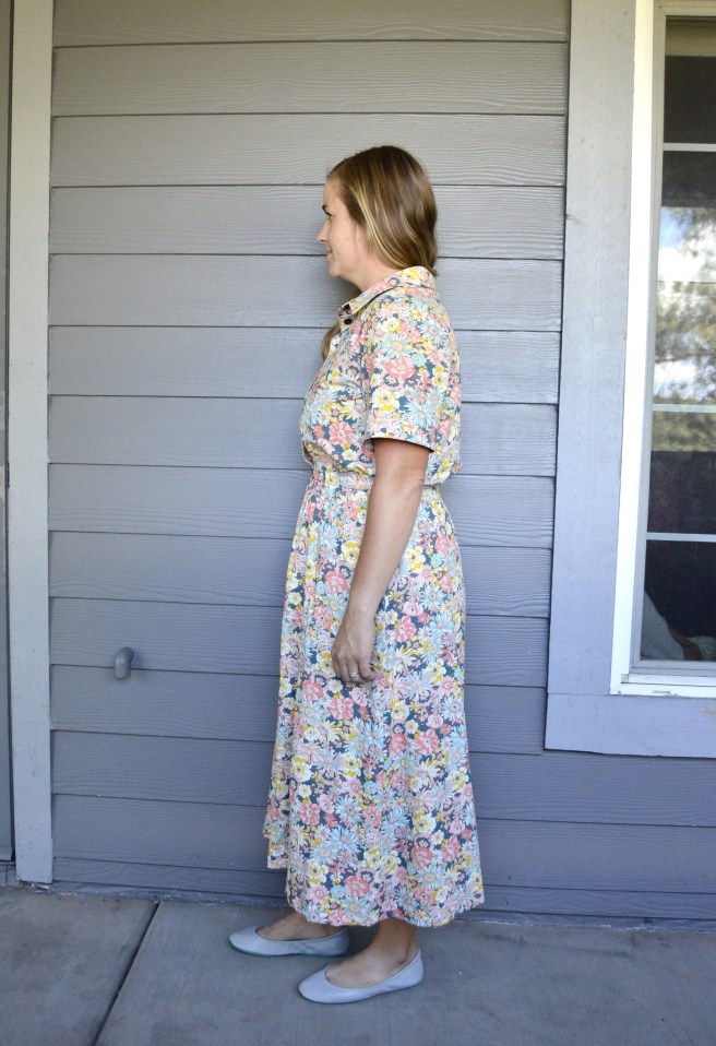 I’ve not sewn enough of the Big 4 patterns to confidently know which size to make for myself. With this pattern, my bust and hip measurements put me in between a size 14 and a size 16 but my waist is closer to a size 18. The pattern lists the finished bust and hip measurements and there is enough ease in the pattern that I felt like I could make a straight size 14 which is what I traced and cut out all before realizing that it never listed the finished waist measurements. So for the entire time I was sewing I was worrying that I’d really messed things up! I was worried I’d have a dress that fit everywhere but the waist! It was a silly oversight and I tried the dress on countless times during the making process to try and reassure myself that it was going to be okay but didn’t actually get any relief until I tried the dress on when it was 100% complete. It does fit, thank heavens, even the waist! I’ve gone back and forth on whether or not I should have sized up to a 16 but I think I’ve come to the decision that the 14 was a good choice in this case. The dress is designed to be fitted at the waist (with the elastic) but more loose and flowy everywhere else. My fabric is more structured so I think it did well with a smaller size to prevent that sort of ballooning look that happens when a pattern is meant to drape but the fabric isn’t made to drape, if that makes any sense. If I had a drapier fabric, I think I could definitely go up to a size 16 to have more of that flowy look (kind of like what’s shown in the pattern’s photo).