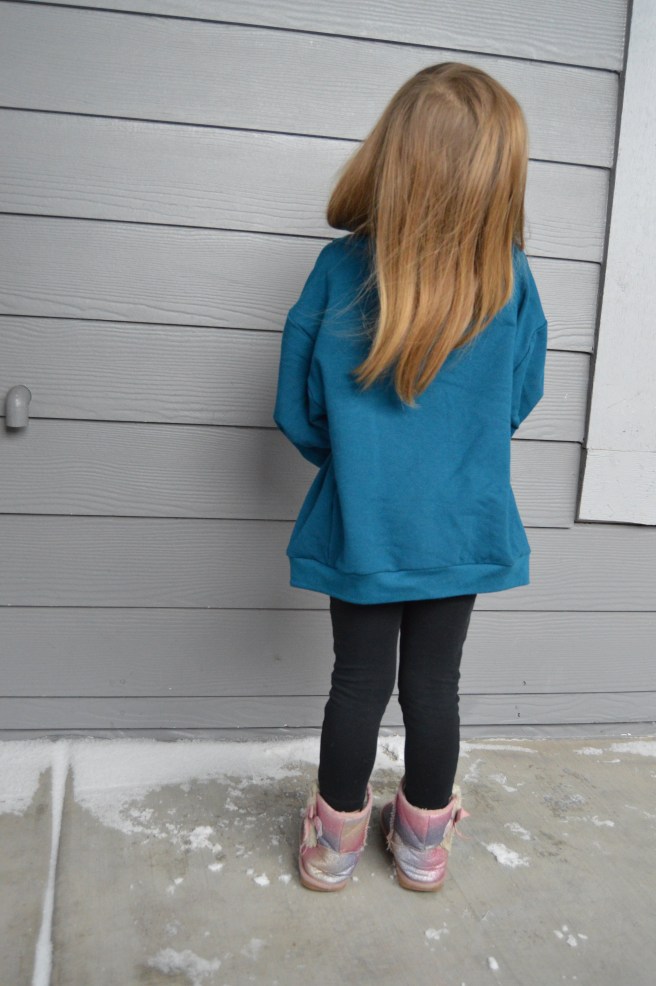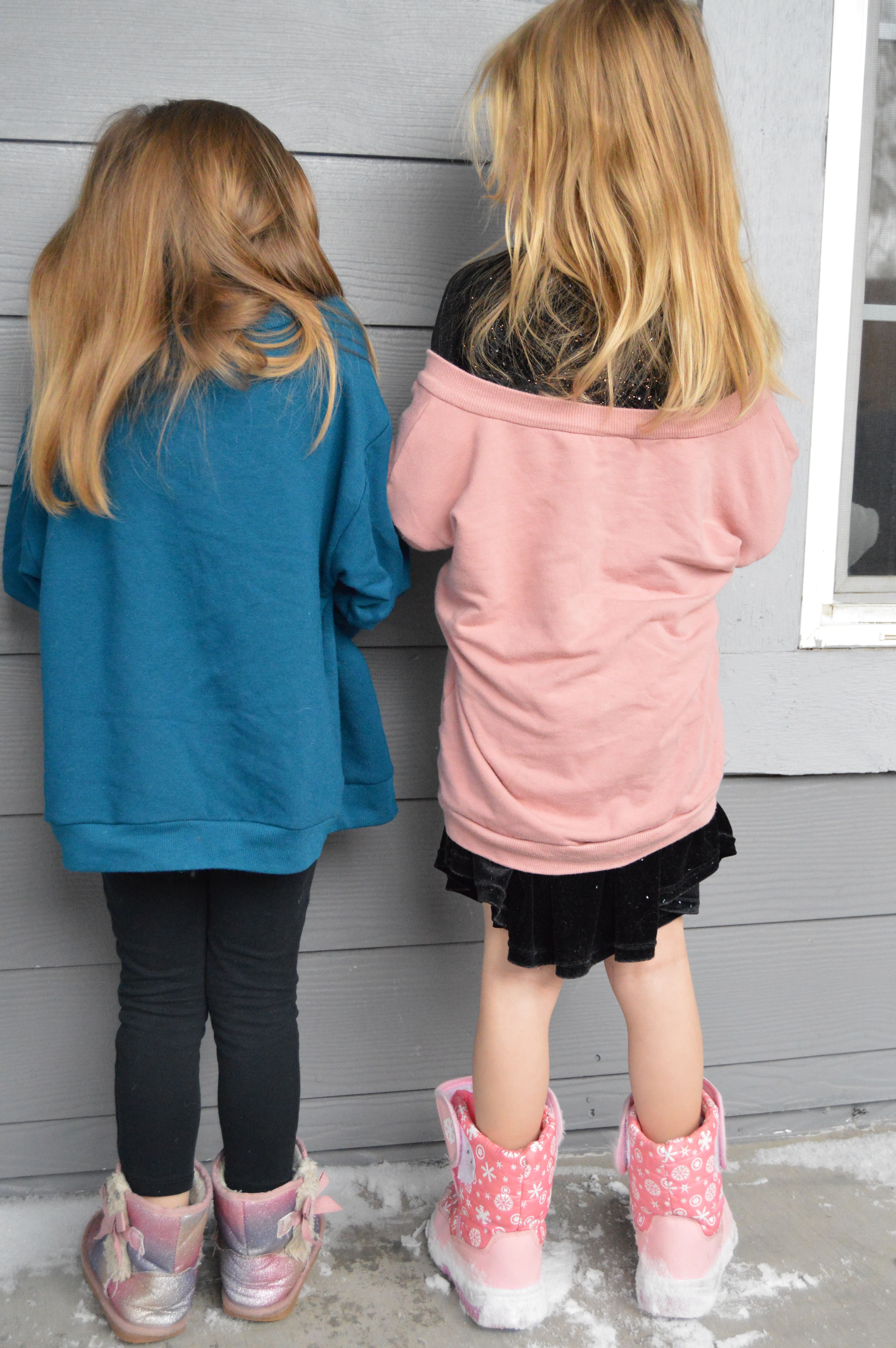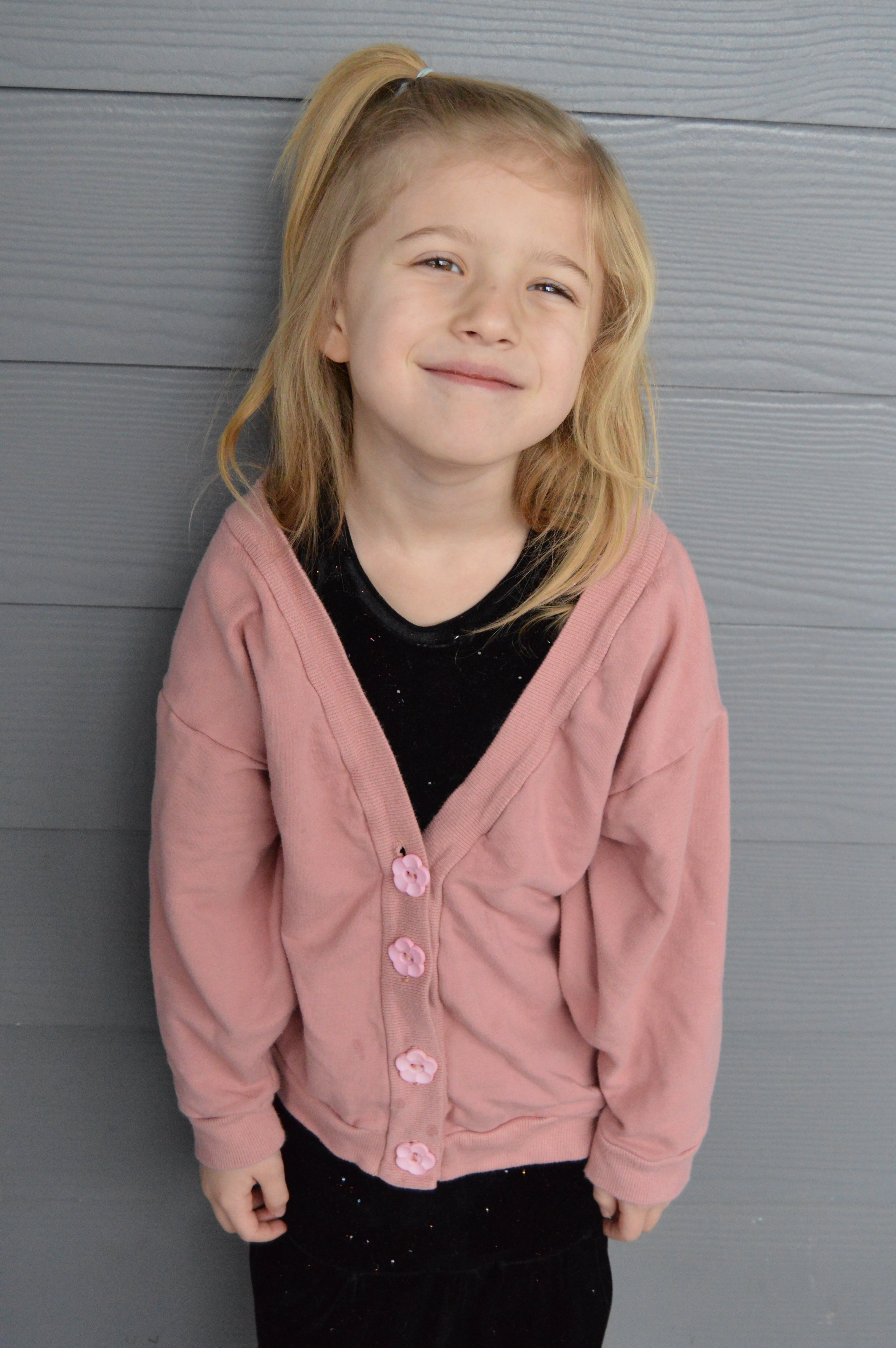 The blue fabric was left over from the sweater I made myself just a bit ago. I had a ton of fabric leftover and the first thing that popped into my mind was to make a slouchy cardigan for my girls. The blue seemed perfect for Greta and I had a couple different options for Wendy but ultimately went with the same fabric, though different color, for her. The fabrics and rib knits are from Blackbird. The main fabric is a really lovely lighter-weight cotton and bamboo fleece with a bit of stretch. I hadn’t previously cut into the pink fabric but I still have plenty leftover-probably close to 2 yards- to make something for myself.