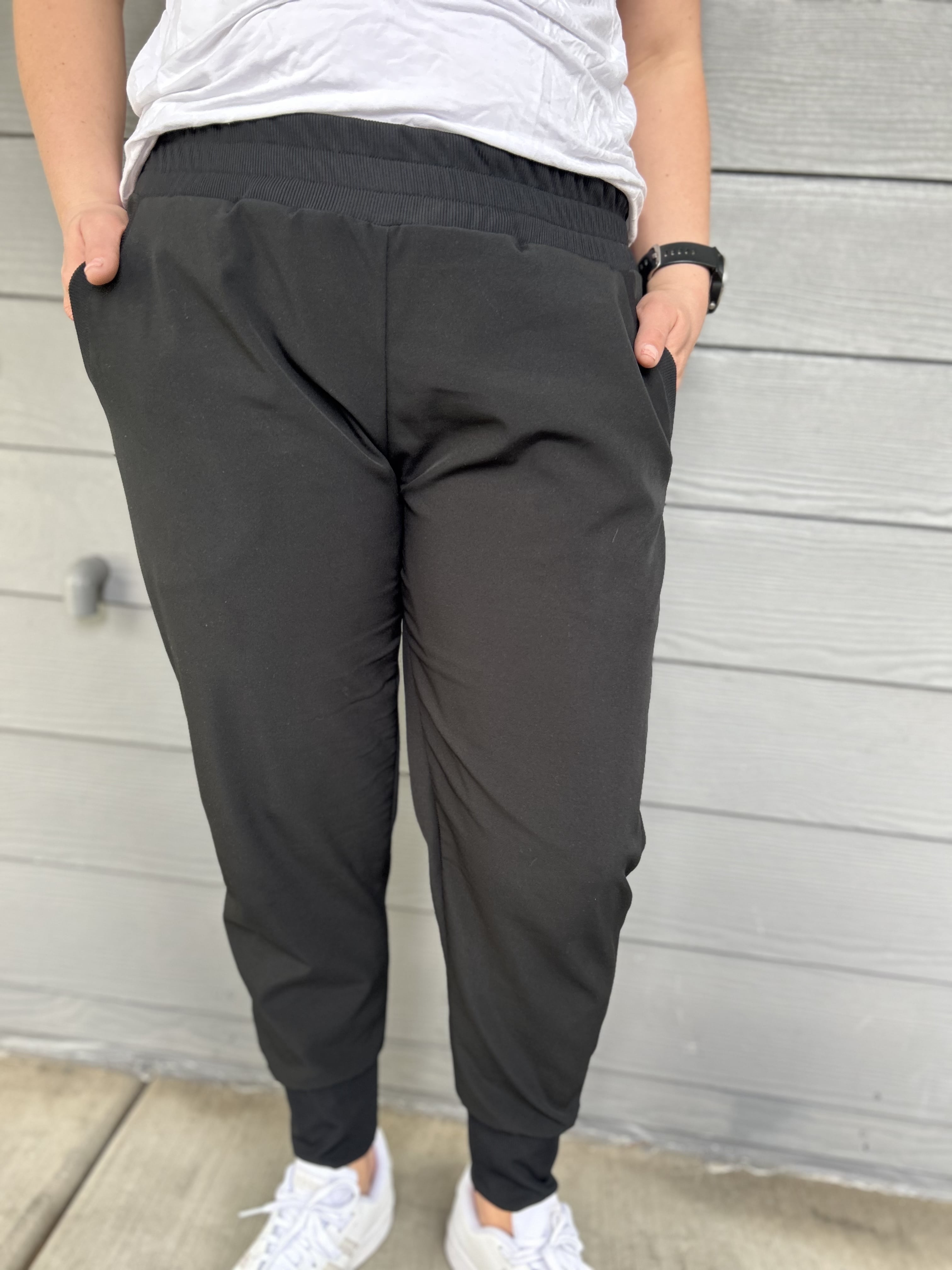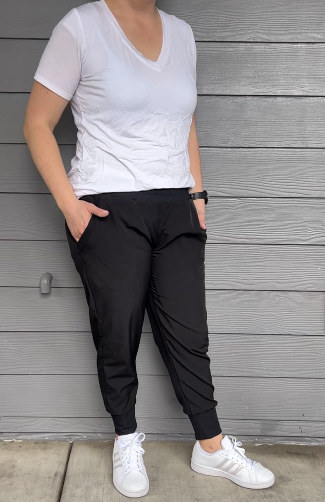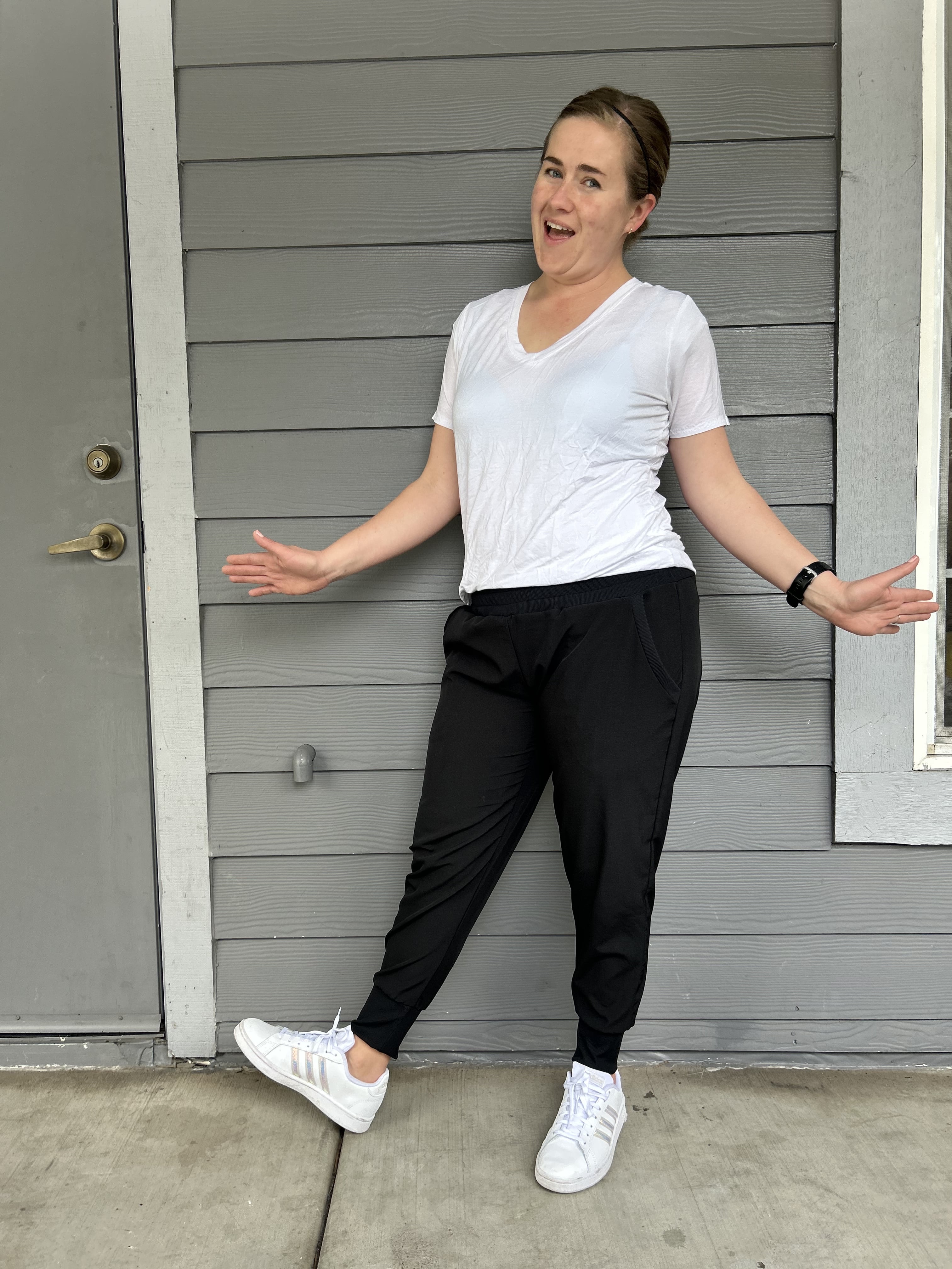 I’ve been very impressed with the level of quality on both fabrics. I’ve been especially grateful that the stretch woven seems to repel dog hair! Our dog’s hair is white and it getting on me is my biggest frustration with wearing black leggings. Somehow these remain remarkably un-haired.