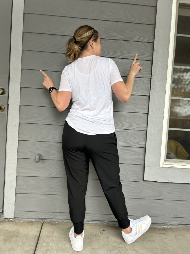 Oh! And you may have noticed my photos are a little different! I didn’t think my regular camera would pick up the black pants very well but I thought my phone might do a good job. I asked my girls to take pictures for me and let me tell you, it was an event. I was surprised that my younger girl took the better pictures, but she also insisted on telling me how to pose so that’s what you’re getting here: a 4 year old’s interpretation of what my blog photos should look like!