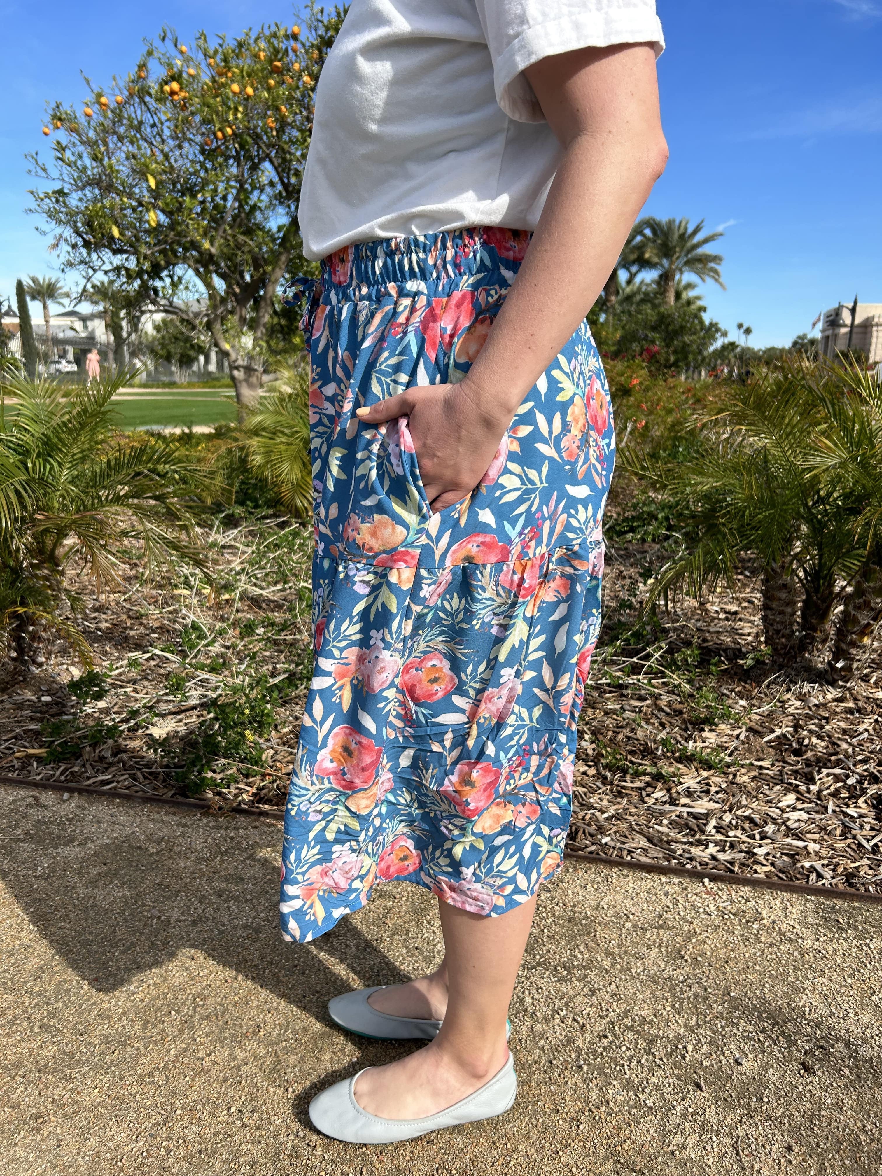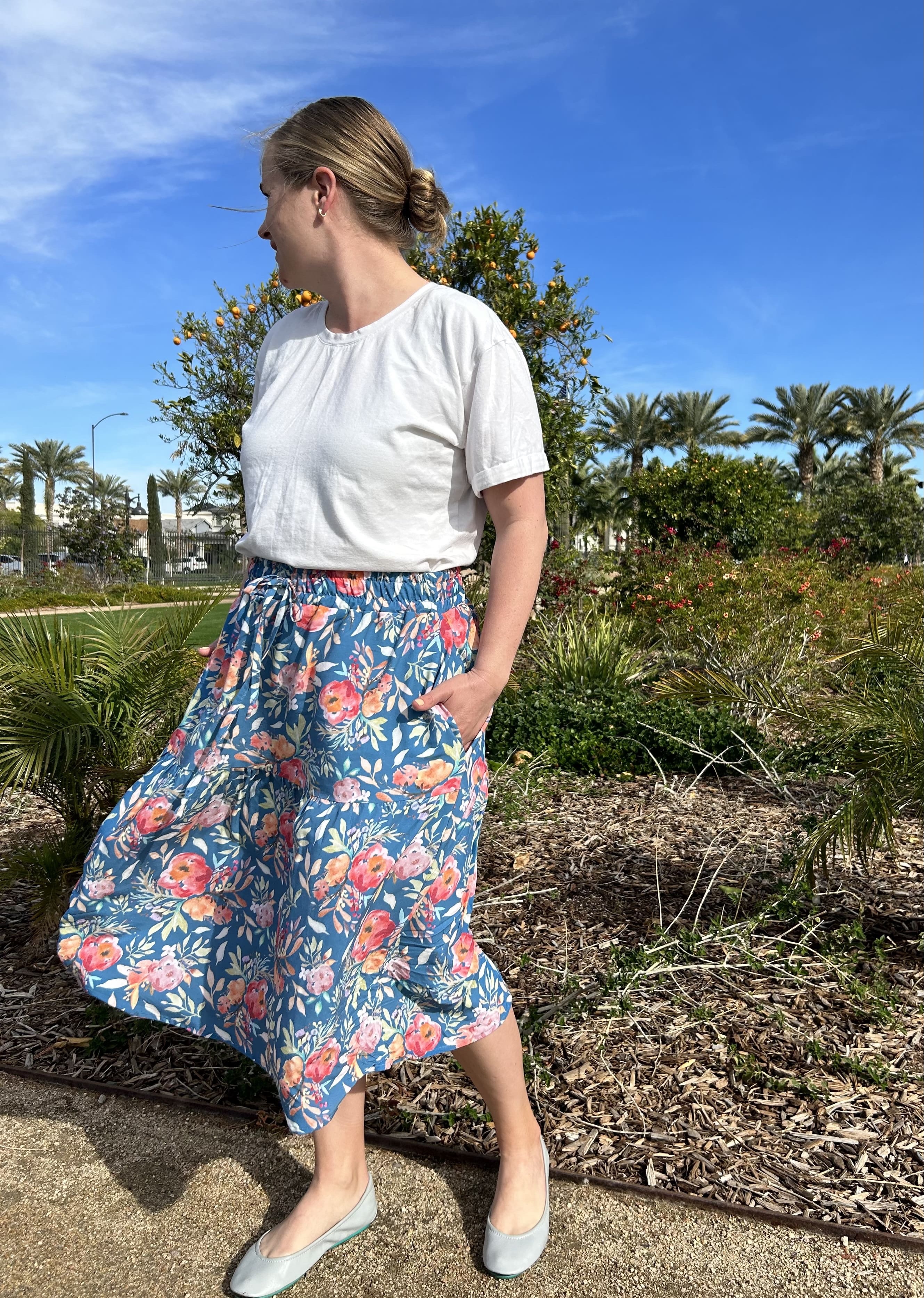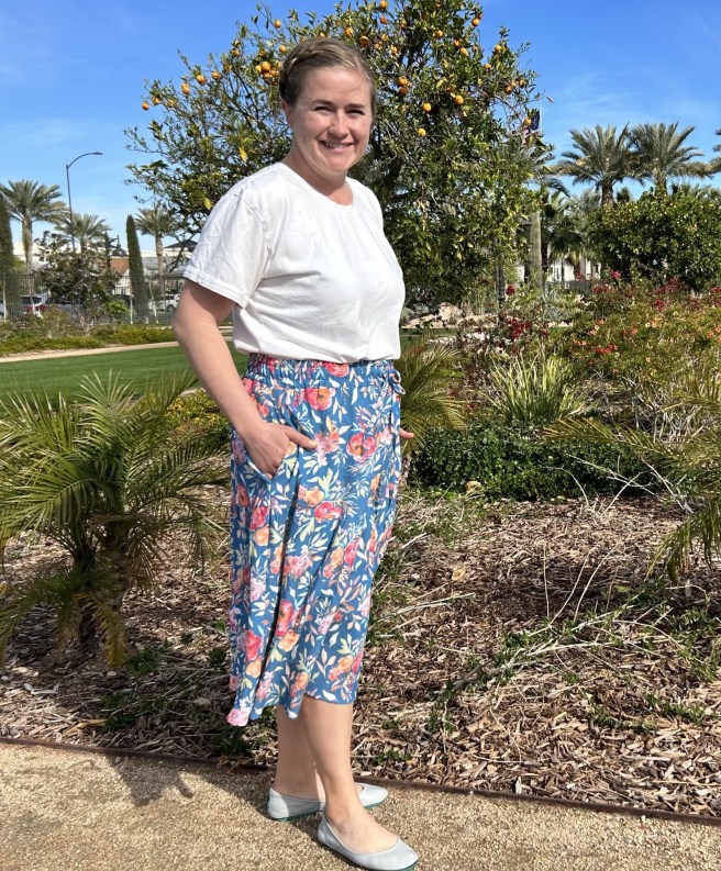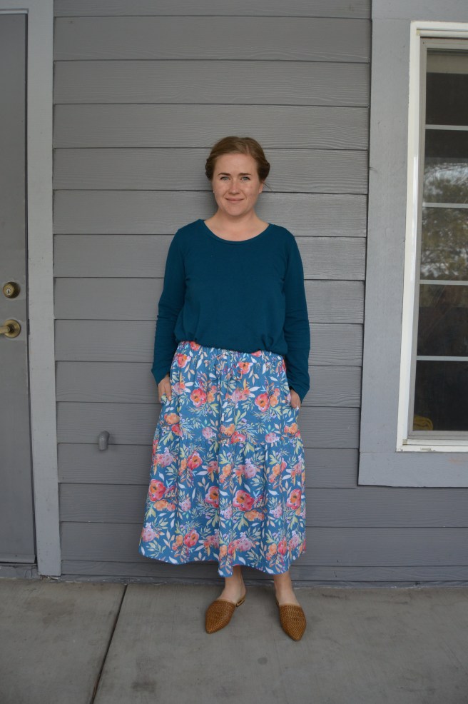 I took my regular porch pictures for this skirt but felt like I needed something a little brighter to feature this lovely fabric, so I had my husband snap a couple photos while we were visiting Mesa this week. Unfortunately we still have (a lot) of snow on the ground where we live but Mesa was a balmy and gorgeous 80°. It was so nice to visit for the day! Hopefully we can see some spring(ish) weather soon!