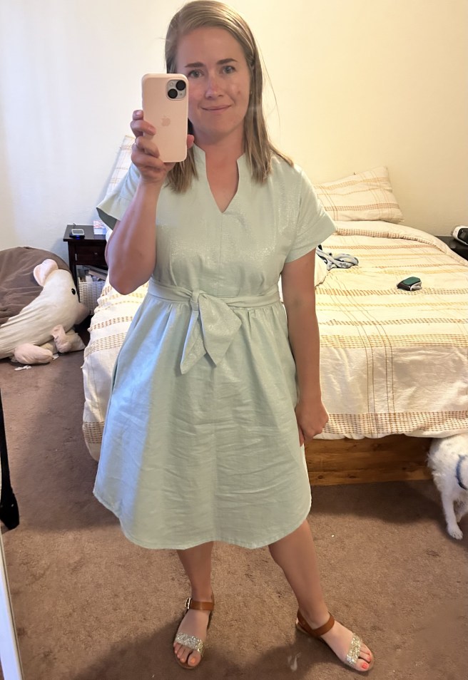 I made this dress almost 4 years ago and have only worn it 3 or 4 times. It’s a linen with metallic threads running through it so it is shiny. But my 6 year old wanted to pick my outfit and this is what she pulled out. I was wary, but I got so many compliments on it! {Fringe dress}