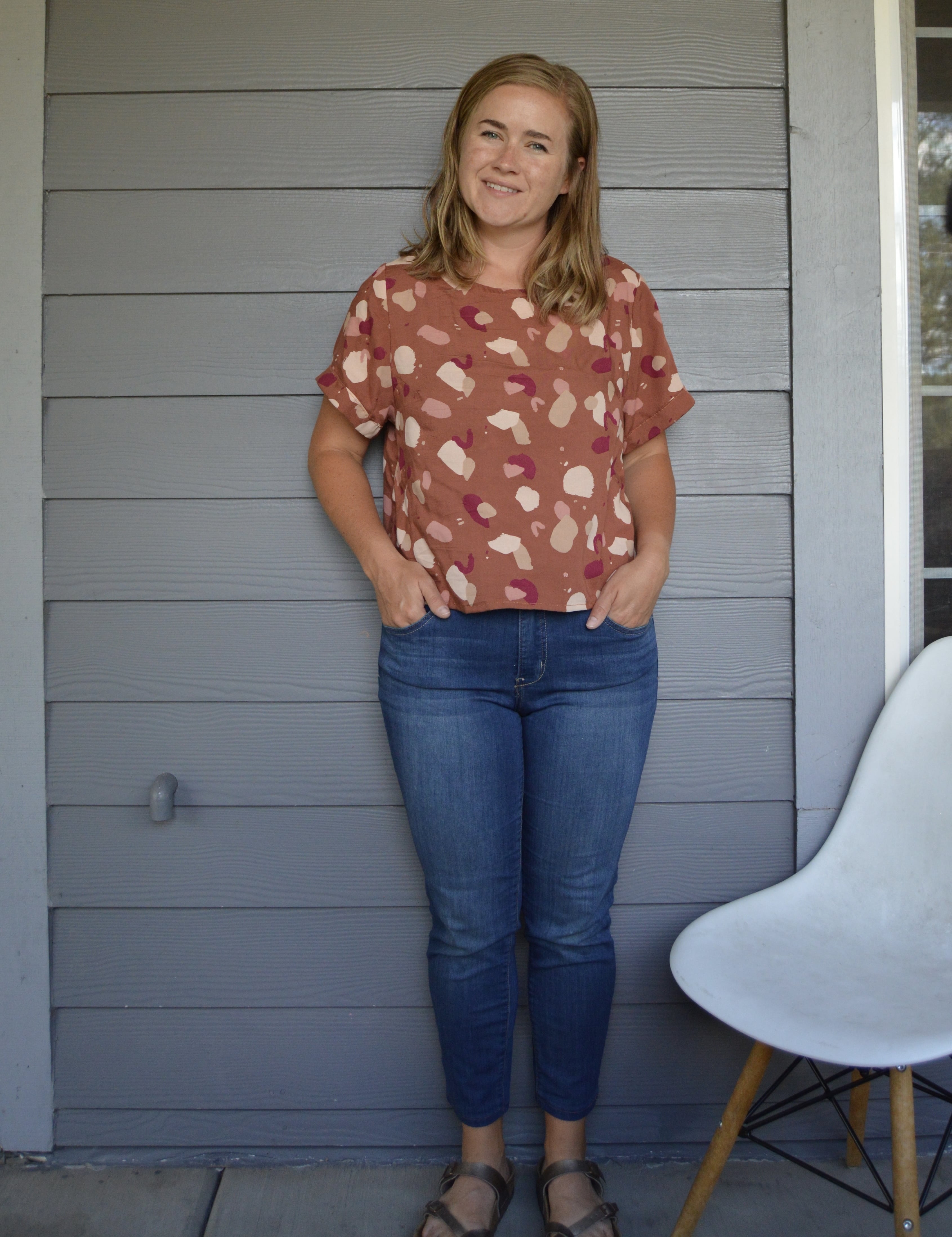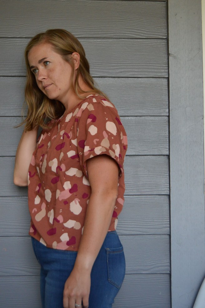 A month or so ago, I was digging through my stash and found this chestnut fabric that had been completely and entirely forgotten. Right before I found out I was pregnant with my third, I made a big purchase from StyleMaker Fabrics. But my size started changing almost immediately and so all the lovely fabric I bought had to be shelved because the yardage no longer accommodated my bigger size. That was a sad day but it was a happy day to rediscover this! I had intended for it to become a Cielo top from Closet Core Patterns and it felt right to let it complete its original destiny (that and I don’t think I have many other ways to use up 1 yard of rayon).