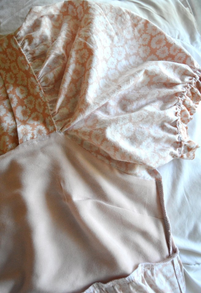 I went back and forth on my fabric. I bought some great navy/teal jacquard from Hobby Lobby awhile back and all through the preparation process, I was imagining using that fabric. But after my final muslin I paused. I was worried that fabric would be too thick. The only problem this would create was that the sleeves might be overly structured which could create a silhouette potentially too bold for me. Now, looking at each fabric, I think the jacquard could very well have worked…maybe I’ll have another Mindy in the works before too long (might as well make use of all the time I put in to making the pattern work for me). But in that moment, I decided to go a safer route and use this pretty salmon colored daisy print. The mystery fabric was given to me by my sister. It’s perhaps some sort of cotton lawn? I’d almost say it’s a quilting cotton but it’s slightly lighter-weight and the width of it was closer to the 54″ that are more standard in apparel fabric. For my lining, I used a light pink cotton rayon blend that was leftover from another project.