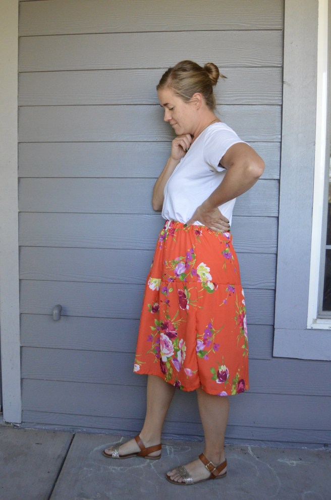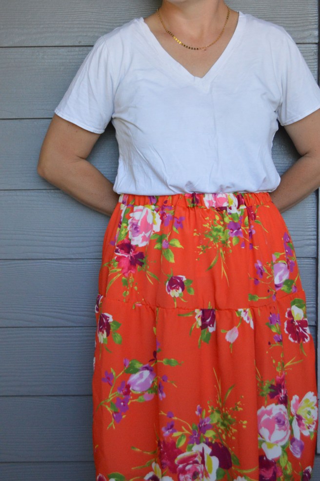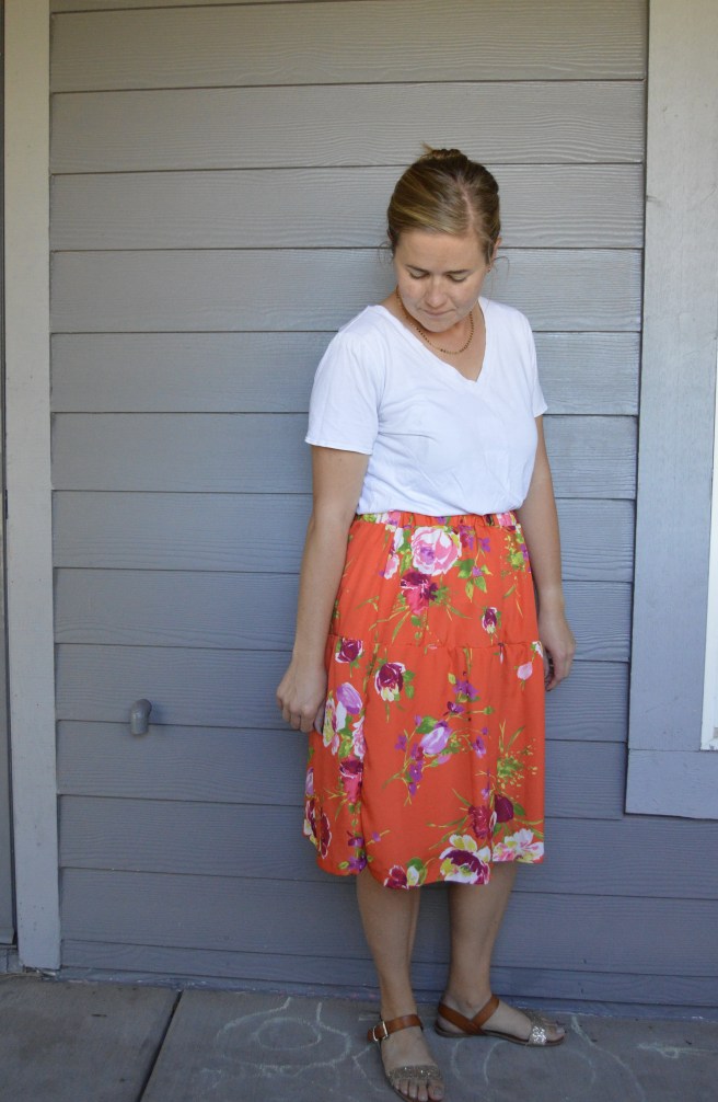 Once I got the skirt out and started taking it apart, it took hardly any time to get it finished. I saved time by not needing to hem. I also didn’t bother with pockets (I might’ve been able to squeeze some pockets out of the remaining side panels but with a skirt so light and airy, and a waistband so thin, pockets would likely not be functional so I didn’t bother!