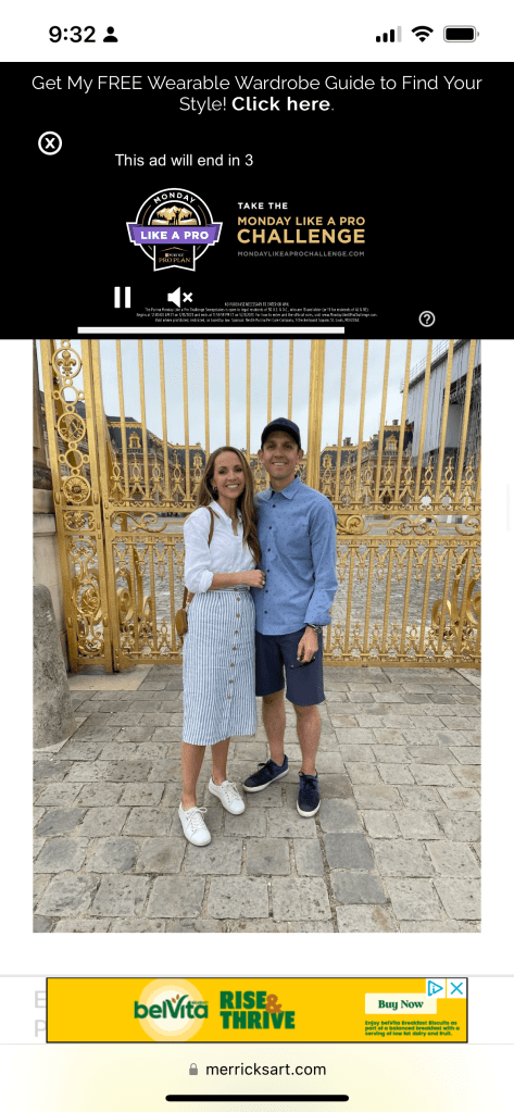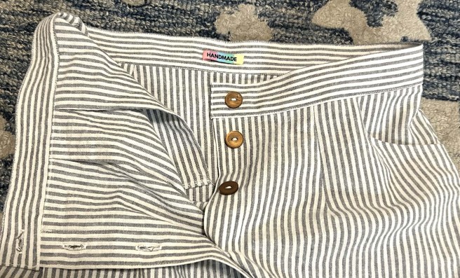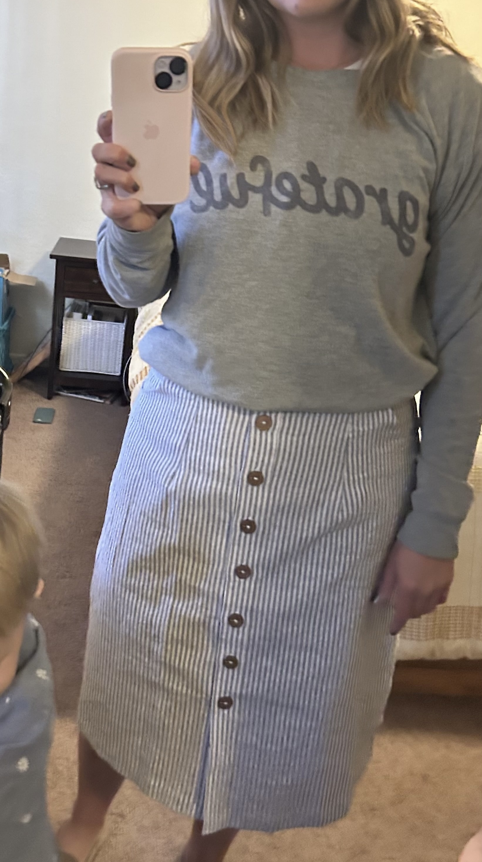 Over the course of some months I searched for fabric and for a pattern. I was ecstatic when I was browsing Hobby Lobby and realized they had the exact fabric I was looking for! This is a striped Essex linen (which is a linen/cotton blend). Hobby Lobby carries a small selection (maybe 4-5 bolts) of Essex linen and it’s a great price. I got a yard and a half and spent only $10 on it. They had another striped linen in stock that had wider stripes which I almost got instead but referring back to my screenshot, I felt like the narrower stripes were more in line with the look of the skirt.