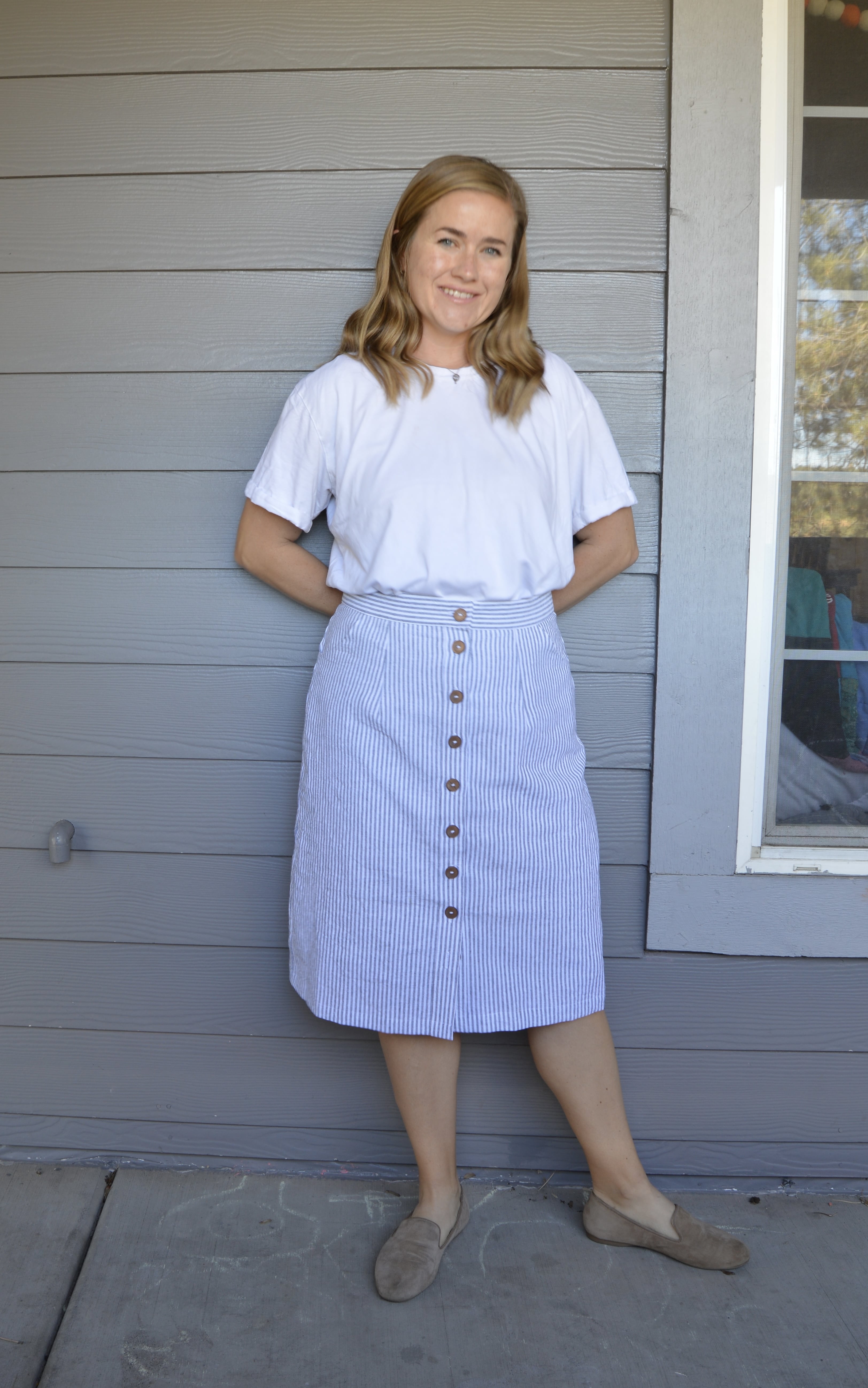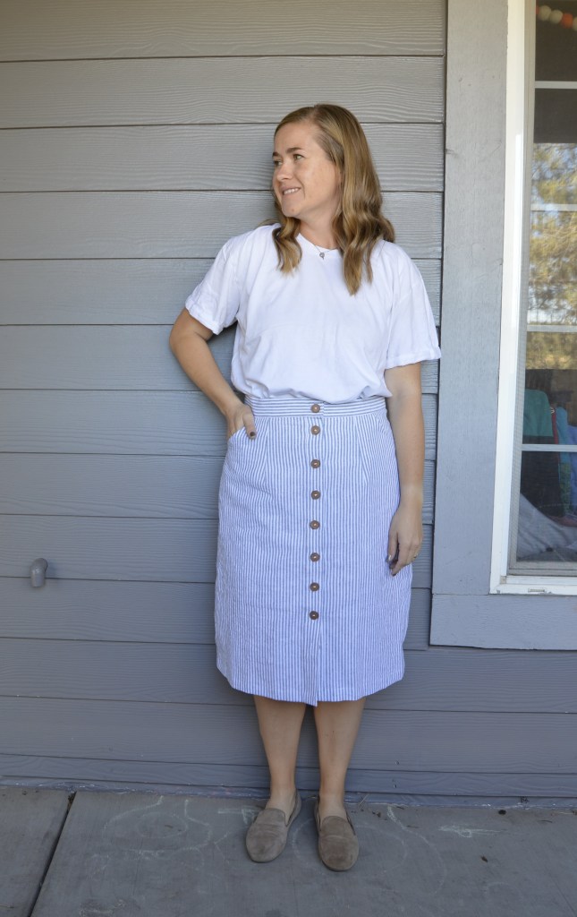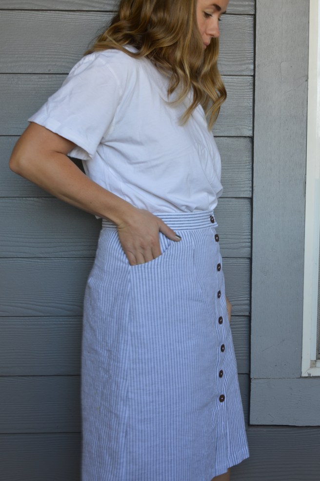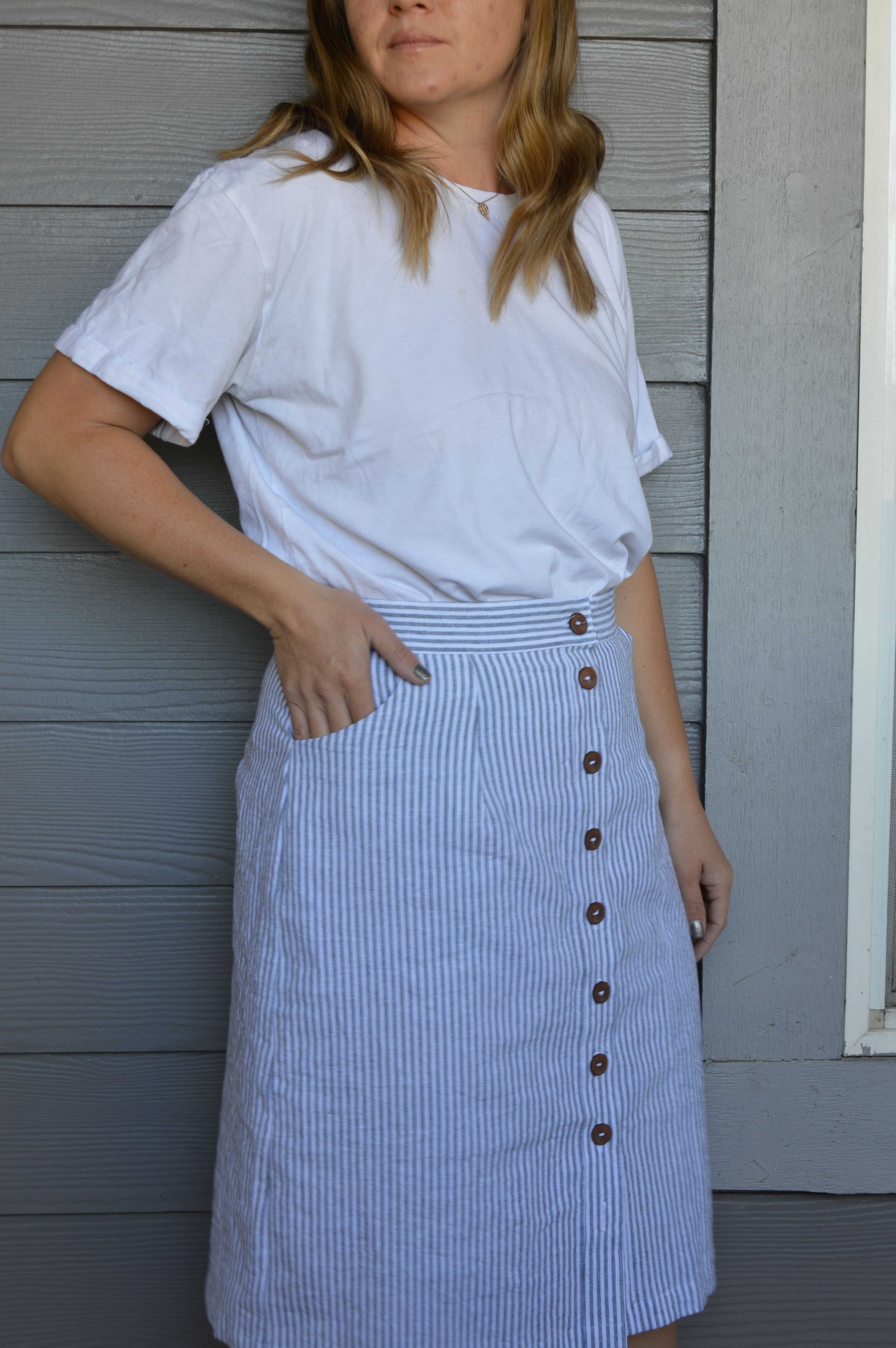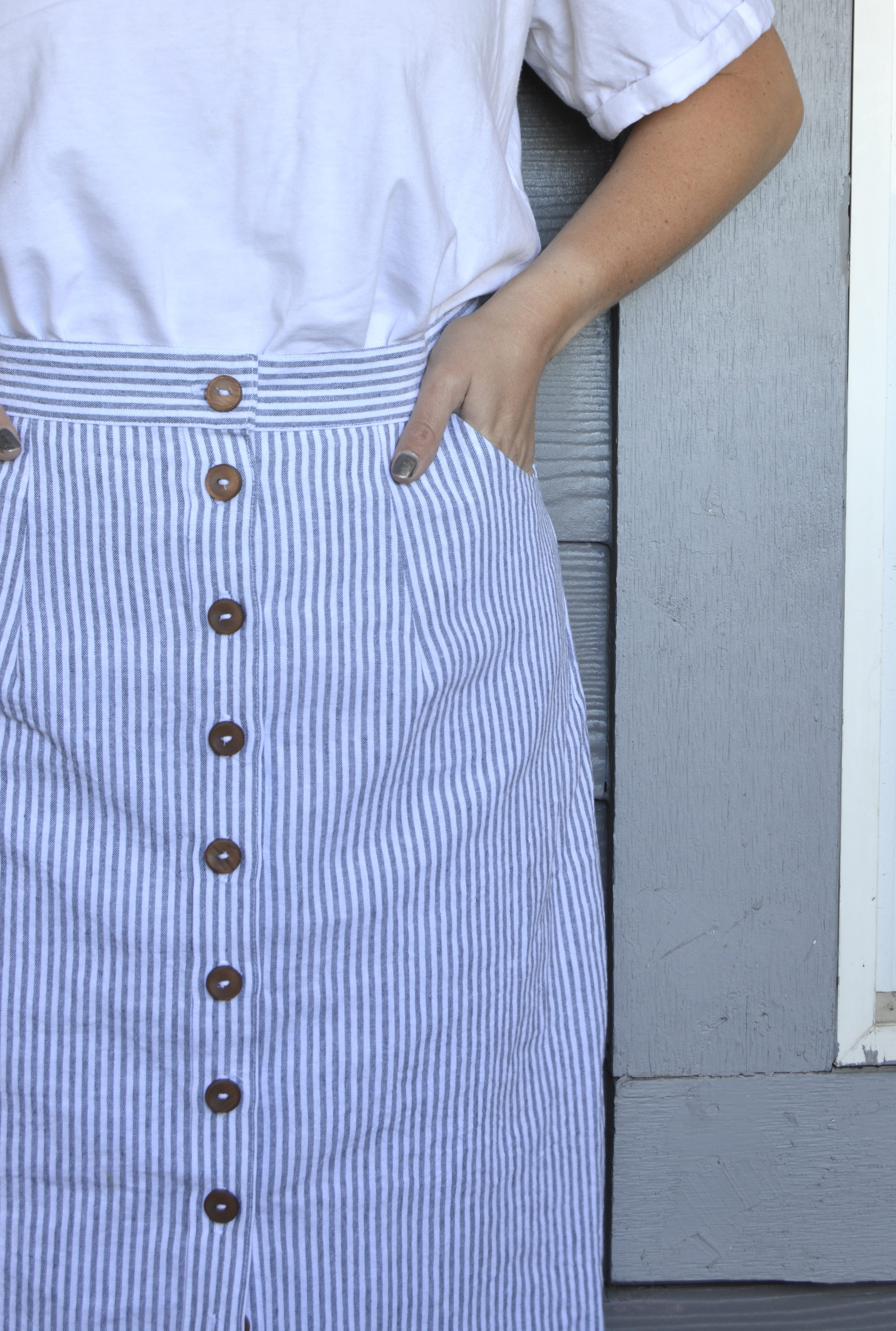 Generally, I do buttons and buttonholes very last-even after hemming-and I got to the point on this skirt where that’s all I had left to do. I decided to save it for the next day but wouldn’t you know that when I went to do it the next day, the buttonhole function on my machine was broken! I was so disappointed (and definitely didn’t have the skirt ready for my trip).