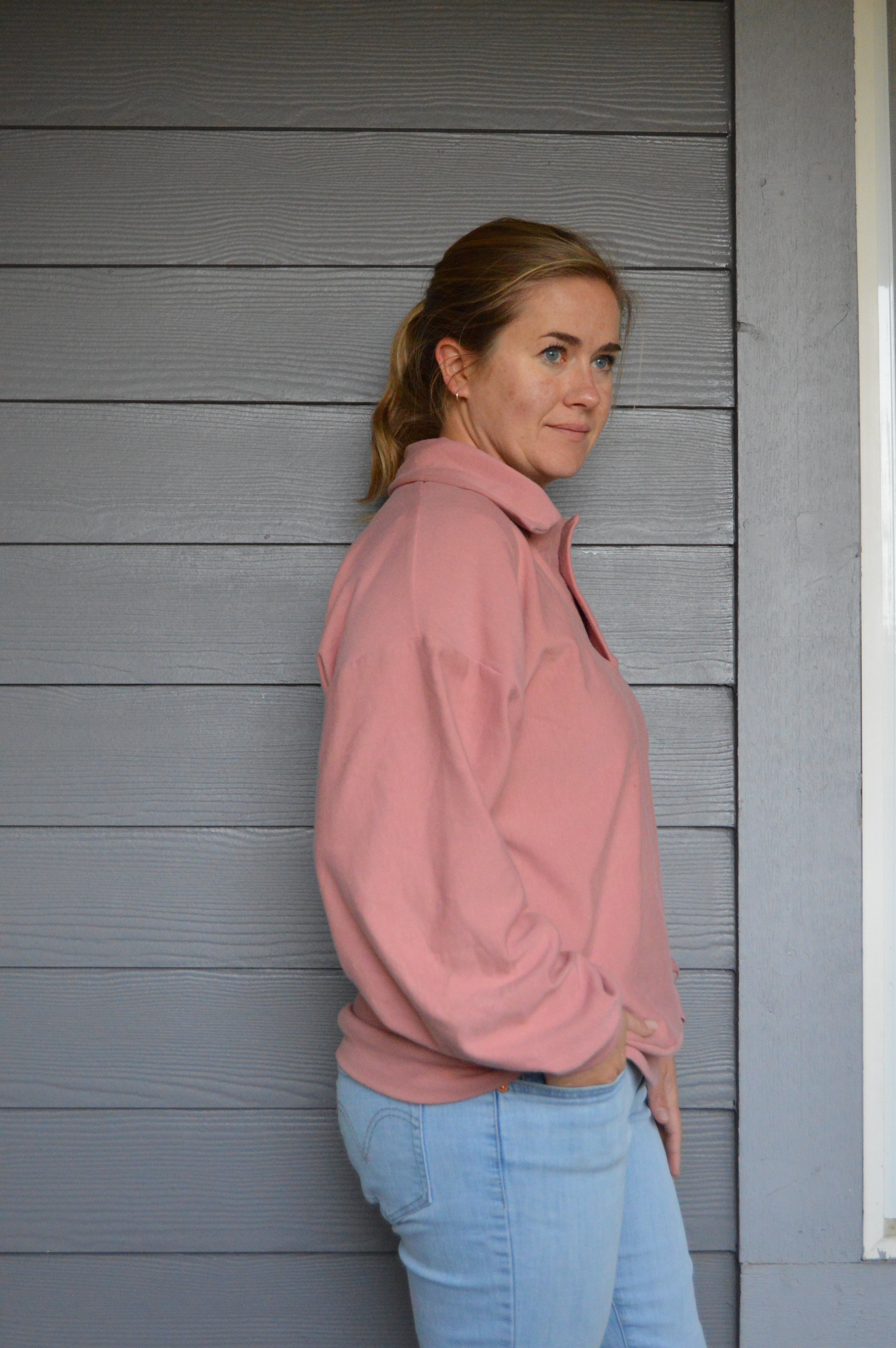 I was excited about fabric possibilities but then realized I had something right in my stash that would work nicely. The fabric is a bamboo and cotton stretch fleece that I bought from Blackbird 2 years ago. I also bought the coordinating ribbing. I used both the fleece and the ribbing on a mini cardigan for one of my girls but I was given a generous portion of fabric and had enough leftover to make this top.