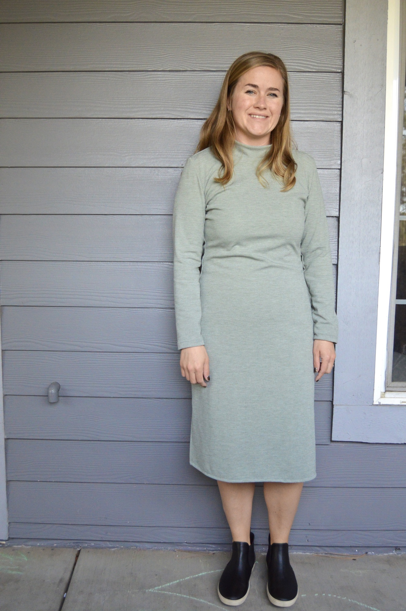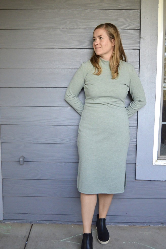 The pattern is the Ruska Dress from the Breaking the Pattern book by Named Patterns. It’s a pretty popular dress but it seems like the knotted tie version is the most popular. This faux turtleneck is harder to find out in the wild. The pattern can also be a top and it has a regular, banded neckline, as well as a short sleeve option, so it’s definitely versatile.
