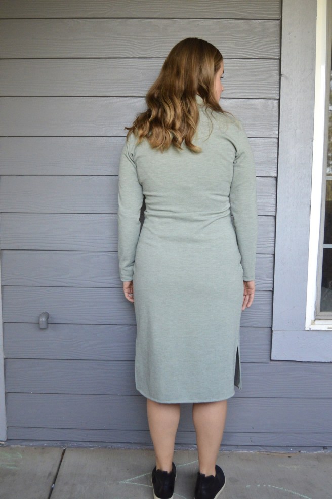 Such was the case here! I’ve had a long standing aversion to both tight fitting clothes and turtlenecks, faux or otherwise, so my expectation sat squarely at zero, maybe below that! I knew full well that I was spending time and money on a dress that very possibly could end up at the thrift store, but I decided to take a chance and go for it anyway. Eh? Pretty brave of me, right? Anyway, I’m very happy with the results! The dress is slightly outside of my comfort zone but I’ve been loving it regardless!