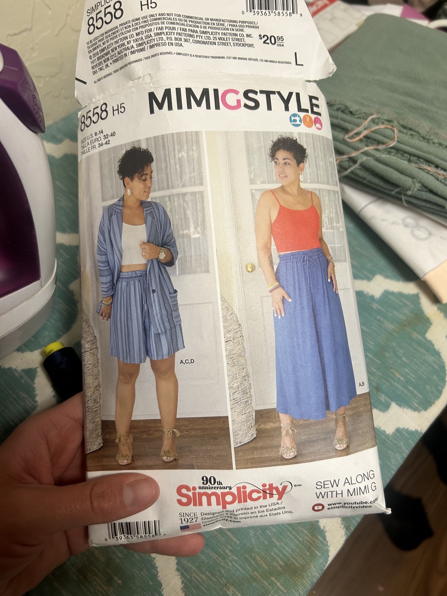 When I went shopping for a wide leg pants pattern, the one I wanted was out of print so instead I opted for this one: Simplicity 8558, which is a MimiG. It includes the pants and shorts, plus the crop top and the blazer which is a steal, even if I probably won’t ever use the other patterns.