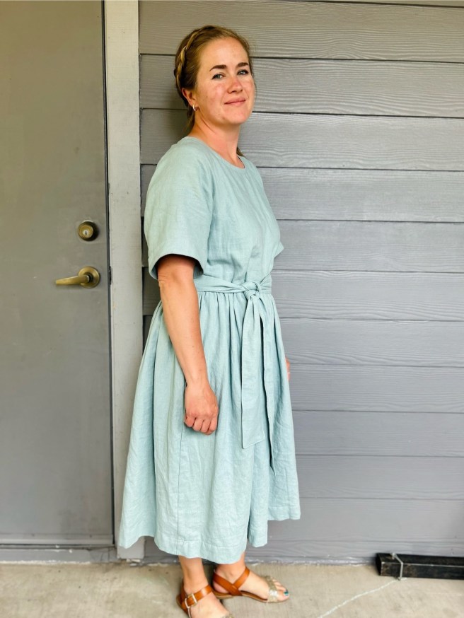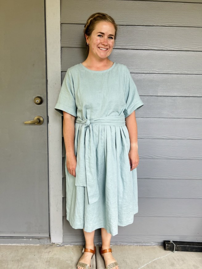 When I did my final try-on, I was happy with how it turned out. But I had the scrap of fabric that I had cut off the bottom of my dress and I wondered if maybe the dress would look better with a waist tie. I tied the scrap around my waist and felt like it was an improvement. With that, along with the long rectangles I removed for the skirt pieces, I was able to cobble together a long and wide sash, with squared ends. I still wasn’t sure if I was going to use the sash, but it felt nice to have the option of it.