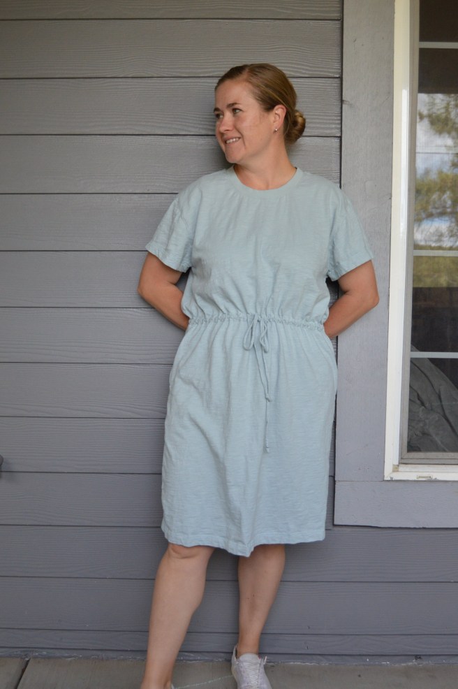 I didn’t even have to tweak the pattern very much in order to make my dress. Because the pattern is drafted to be oversized, I just extended the seam lines straight down to make the top knee-length instead of hip-length. I added pockets because I could. And then I made a channel for inserting a drawstring that sat right at my waist.