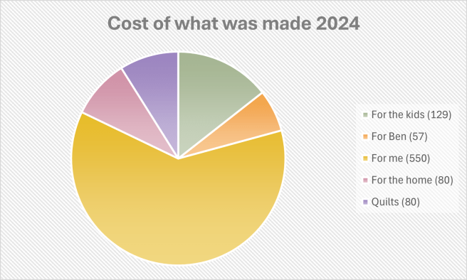 The above pie shows what I spent money on this year BUT many of the things I made this year were made using fabric bought pre-2024. I wanted to see what I spent on the things I actually MADE in 2024. So I itemized cost per project made and added that up instead. Of course, a lot of these overlap but not all.
