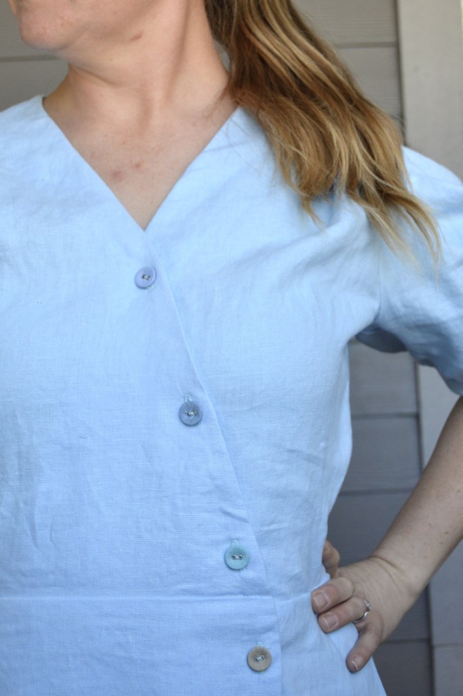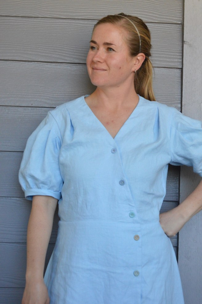 So anyway, that’s the dress! It’s not a total wasted effort, though I don’t think I’ll be wearing the dress again until I make the changes that I mentioned. I also stopped short of doing some finishing touches (like adding a tie or button to keep the inside part of the wrap in place), so I need to keep working on the dress. But I think once I get around to those things, I’ll end up with a dress that I enjoy wearing. I absolutely loved the pattern-it’s a unique design that can be taken many different ways. So I plan to eventually fix this dress, but I also hope that I can make the other versions of the pattern as well. Maybe a mild stretch woven would help out with the fit issues, after addressing the sleeve volume. But I love a good wrap dress and this one is pretty versatile.