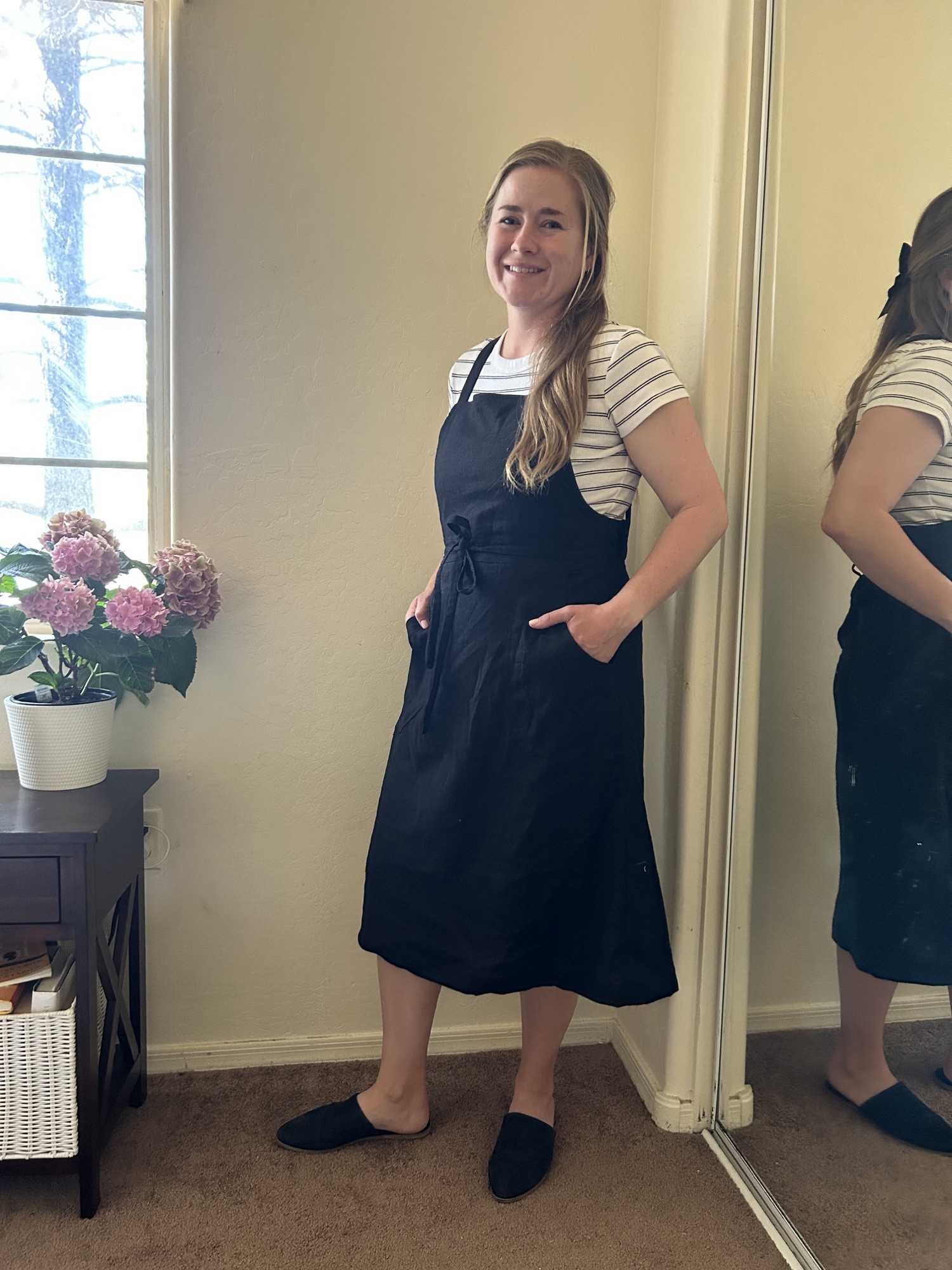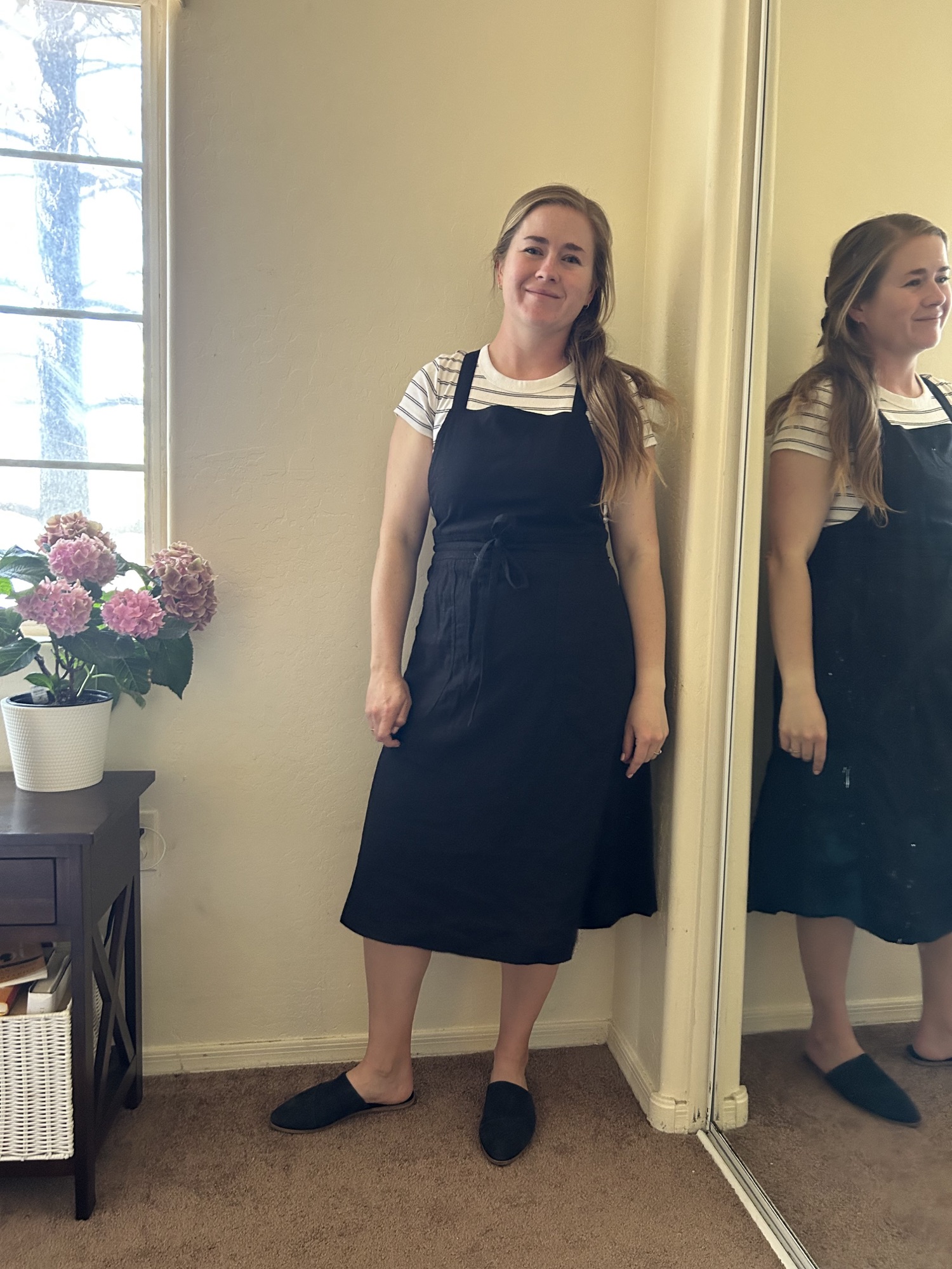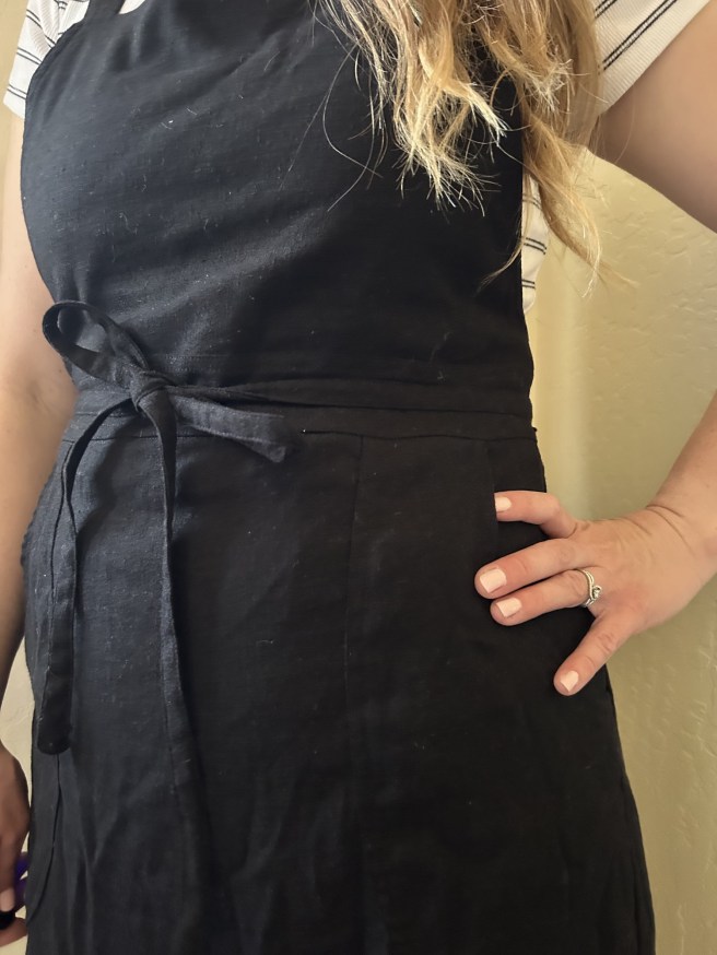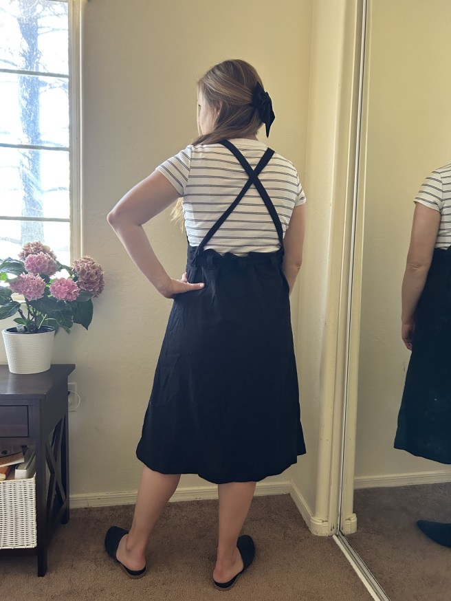 Another favorite feature is the back. The bib has these long ties that cross in the back and then are threaded through the belt loops and can be tied in the front or back of the dress. I’m a fan of the paper-bag waist look and I like how it’s featured, though subtly, here. I also will never say no to something that can be adjusted and readjusted as necessary.