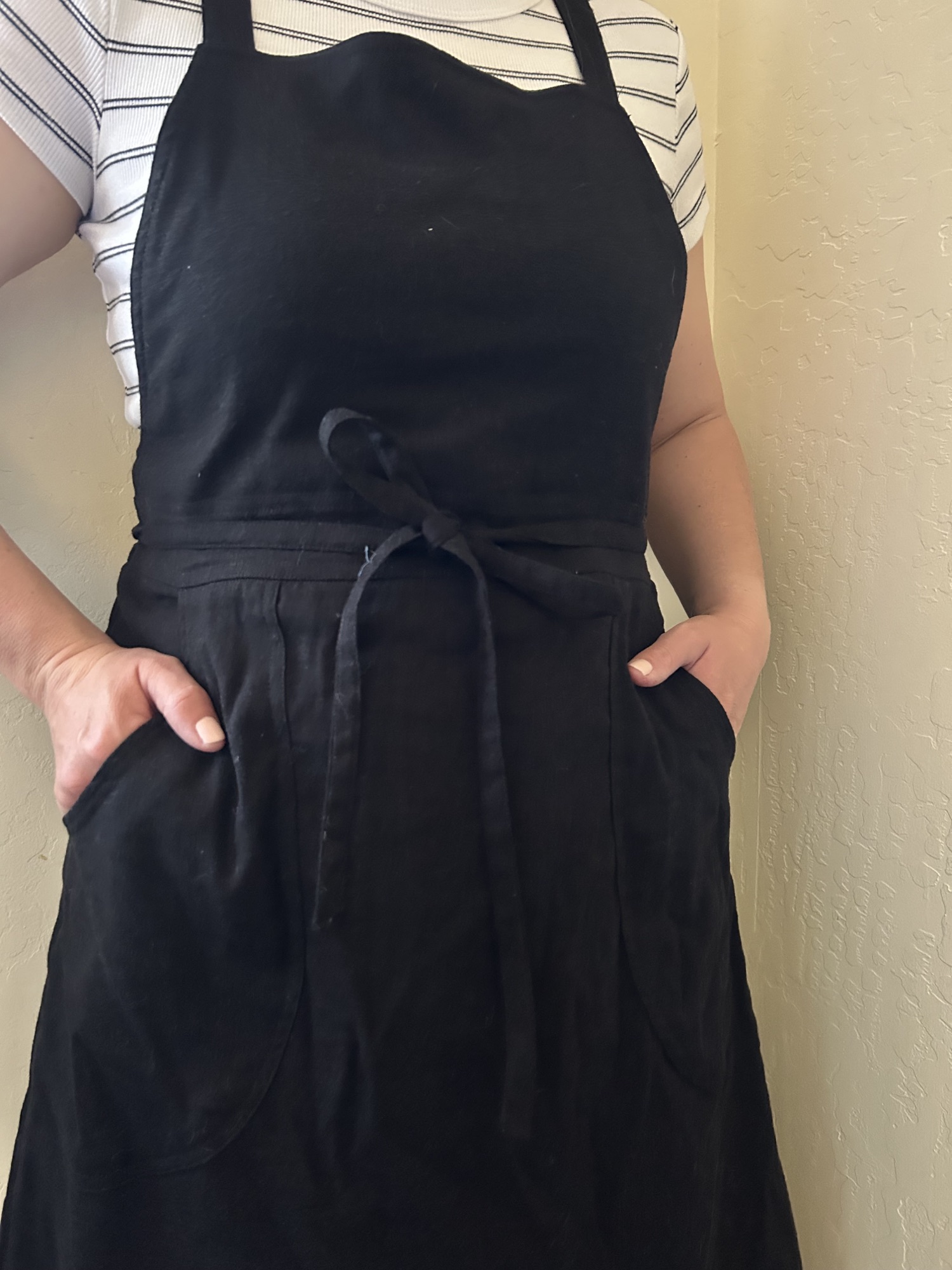 I chose view C which features the A-line skirt, straight bib, and exterior pockets.