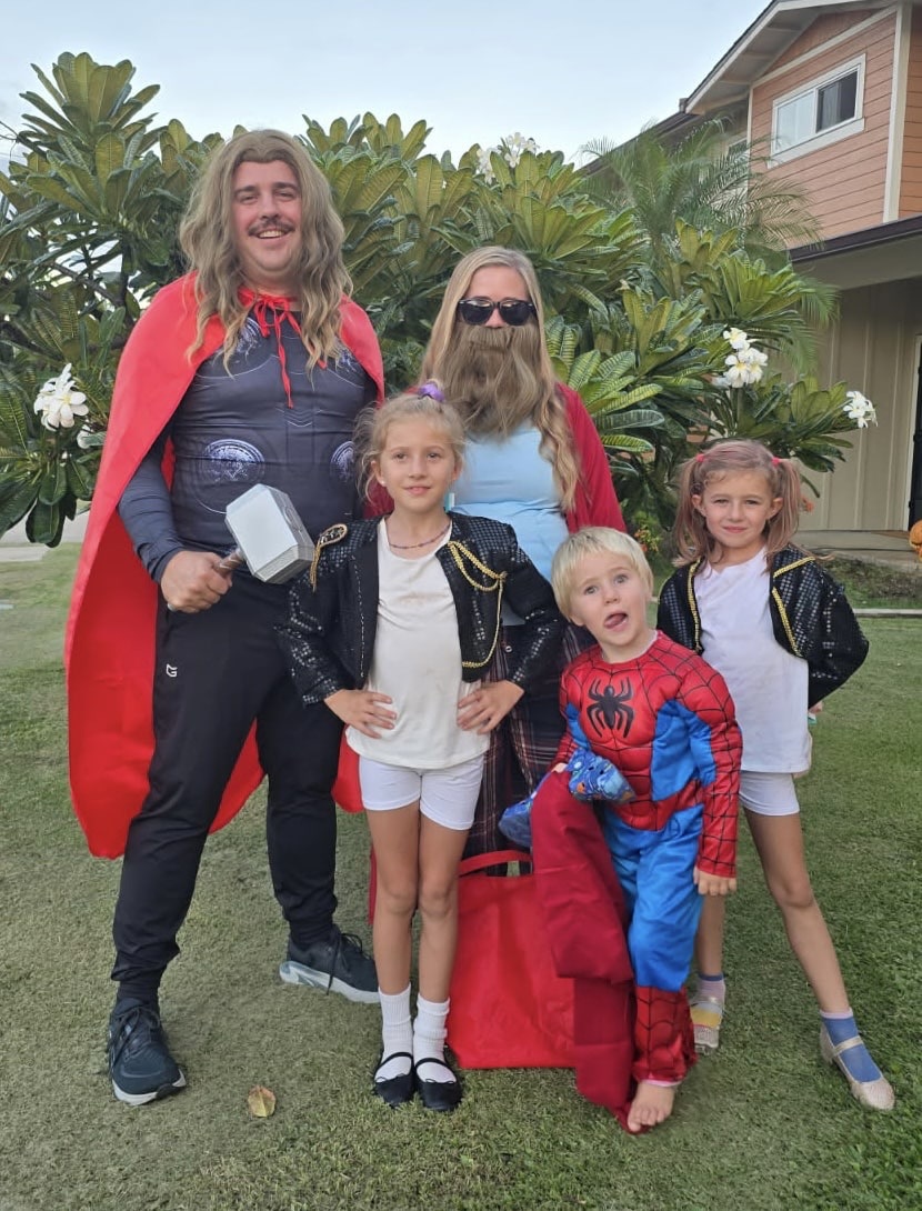 I kept handmade elements pretty minimal this year, only making the girls’ jackets and my robe. We are dressed as Thor, Thor in Endgame, Rumi and Mira (from K Pop Demon Hunters), and Spiderman. Hope everyone has a great last day of October!