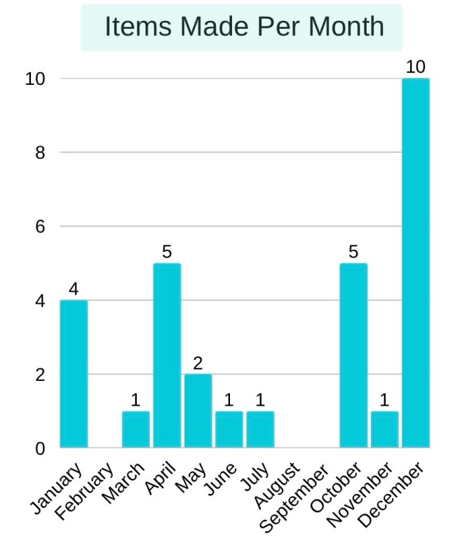 I especially wanted to include the “For Holidays” category this year because it made up a quarter of my sewing expenses! That’s not nothing! You can see the impact here, as well, with items made per month: