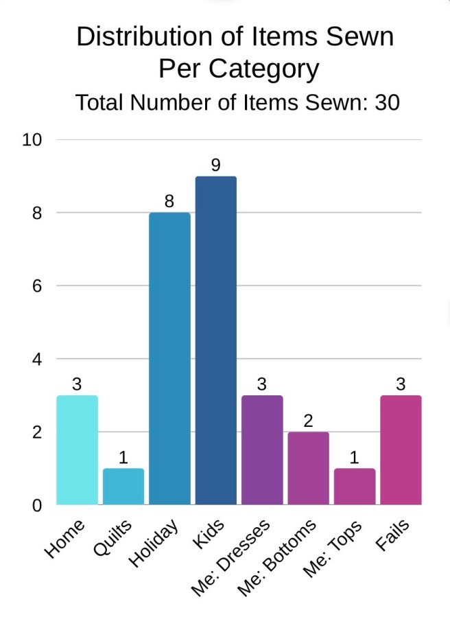 I included “Fails” in this bar graph! For me, a “fail” means that I started sewing something that I never finished. The first fail was a dress for myself that was clearly going to be too small. Thankfully, I had been using a cheap fabric that gave me no sense of loss when the project was scrapped. The other two fails were dresses for my girls that I was trying to create without a pattern but I was seriously hating the results, so those got scrapped as well.