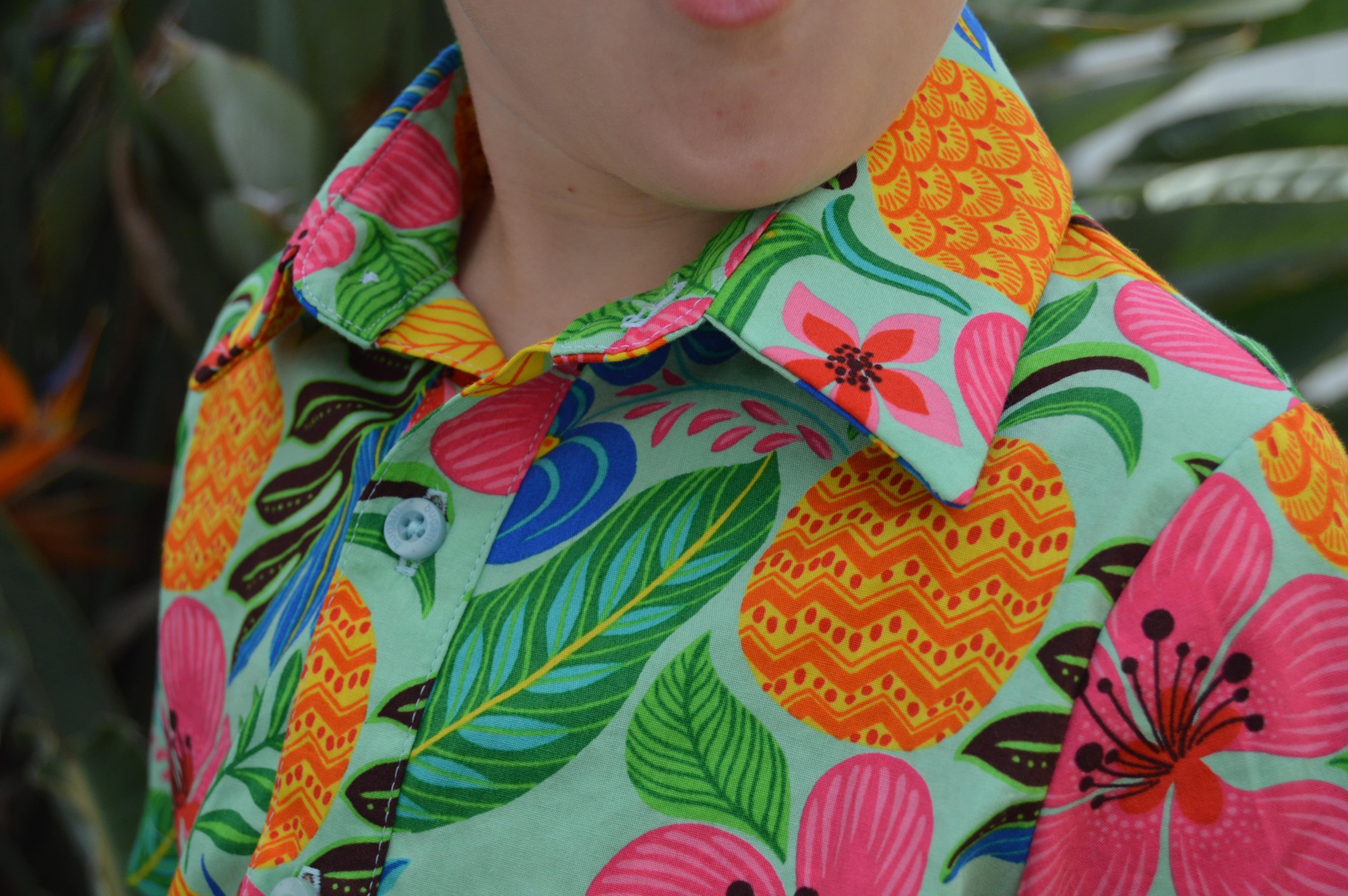 For both shirts, I just used buttons from my stash. The pineapple shirt in particular looked great with a surprising variety of buttons. I really could have gone with different shades of pink, yellow, green, or blue. In the end, I chose light blue for both shirts, but mostly just because these were the colors where I was able to find the appropriate number of matching buttons.