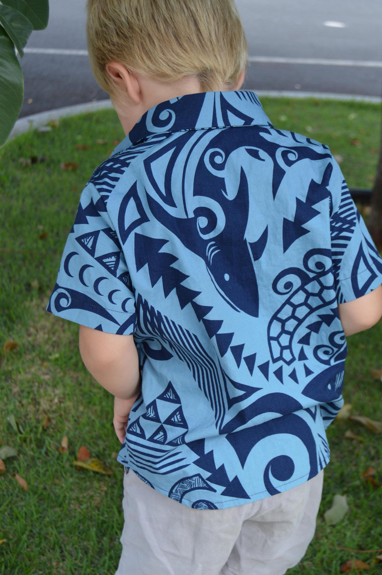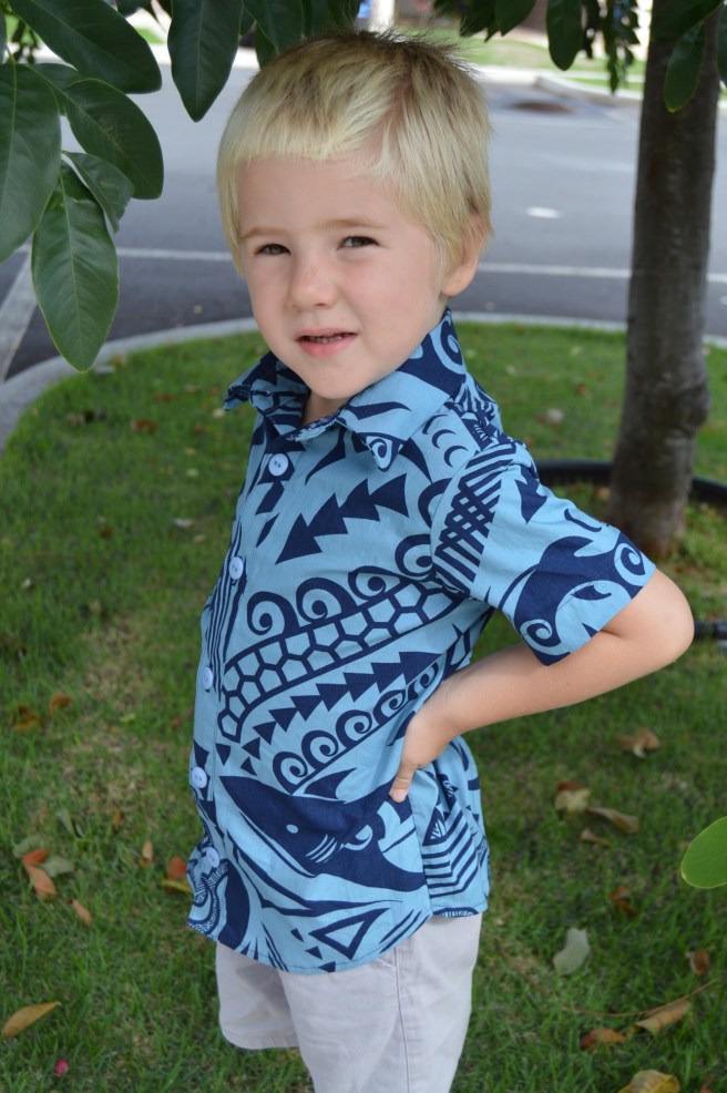 When I showed my son the selection of fabrics he could choose from for a shirt, he only had eyes for the blue shark fabric. Because sharks, duh.