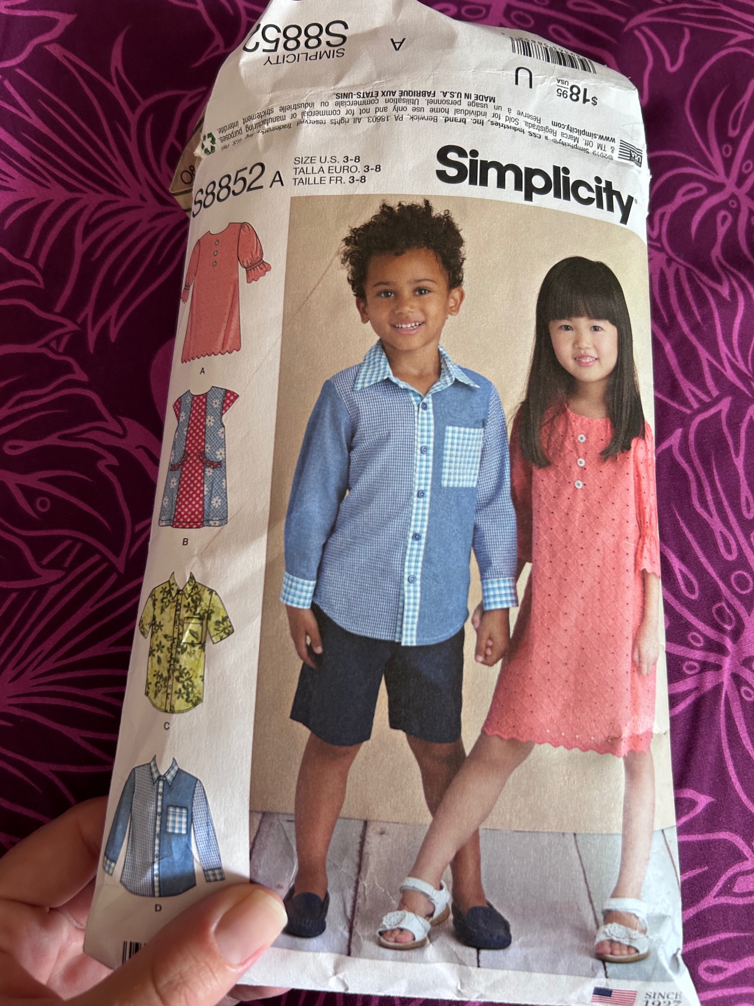 For the pattern, I decided on Simplicity 8852. The pattern comes with short sleeve and long sleeve options, as well as a pattern for a simple A-line dress (I actually made the dress for my daughter. It turned out cute buuuut she totally hates it. We’ll see if it ever gets photographed and/or blogged!). It comes with sizes 3-8 which is good for my son (but nearly has my girls sized out…not, I suppose, that it matters!).